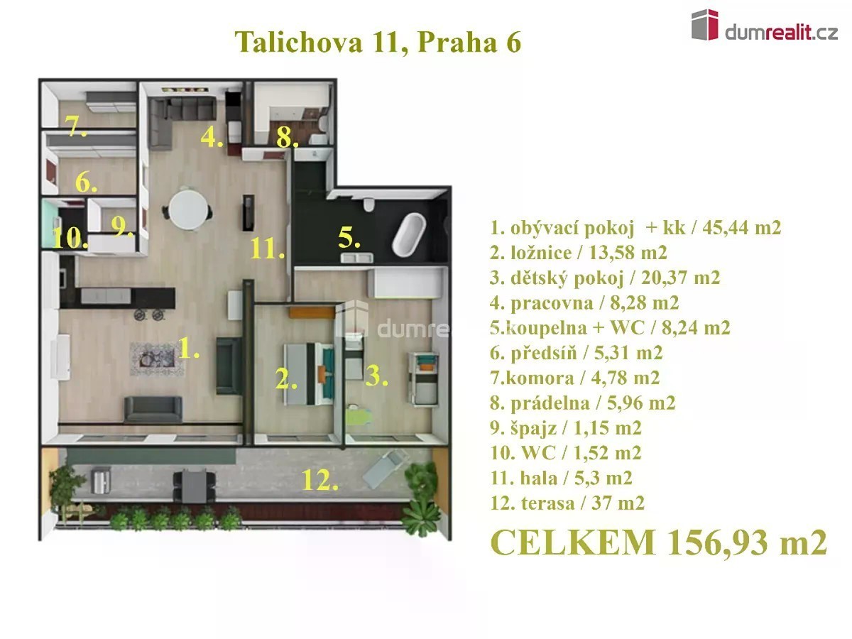 Hledáte byt 3+kk po nákladné rekonstrukci s velkou terasou, ideálně v Praze 6, v Top lokalitě? Mám zde pro vás exkluzivní nabídku kompletně zrekonstruovaného bytu 3+kk (120 m²) s terasou (37 m²) v Praze 6 - Břevnov, ulice Talichova, v docházkové vzdálenosti od parku Břevnovská klášterní zahrada. Tento byt byl v roce 2013 kompletně zrekonstruován a je v TOP stavu - kompletní interiéry vč. změny dispozice na 3+kk (lze předělat na 4+kk), podlahy, vstupní dveře, interiérové dveře, plastová okna - trojskla, topení - konvektory, elektrika, koupelna + WC, kuchyně + spotřebiče a terasa. Dispozici tohoto moderního bytu 3+kk (120 m²) tvoří: prostorný obývací pokoj prakticky spojený s kuchyní (45,44 m²) a se vstupem na terasu (37 m²) s výhledem do zeleně - orientace jihovýchod, s jídelním koutem s prostorem pro odpočinek (8,28 m²), ložnice (13,58 m²) se vstupem na terasu, dětský pokoj (20,37 m²) také se vstupem na terasu, předsíň (5,31 m²), velká komora (4,78 m²), spíž (1,15 m²), hala (5,3 m²), prádelna s prostorem na pračku/ sušičku a umyvadlem (5,96 m²), velká koupelna (8,24) m² s volně stojící vanou, sprchovým koutem a umyvadlem. Ve velké kuchyni od společnosti Sykora je vestavěná lednice s mrazákem, varná deska, 2 x digestoř s odtahem mimo byt, myčka, vestavěná trouba, parní trouba a vinotéka. Pracovní deska je z umělého kamene technistone. Byt lze předělat na 4+kk velmi jednoduše - viz 3d plánky. Vytápění bytu je centrální dálkové, SVJ nemá úvěr, výtah, střecha, stoupačky, zateplení domu jsou po rekonstrukci. Vstup do bytu v tomto kaskádové domě je bezbariérový, je z ulice Talichova, v 8.patře je výtah, byt je umístěn ve 3. patře domu. Byt je volný ihned, je v osobním vlastnictví, v rámci služeb RK Vám zařídíme exkluzivní hypoteční úvěr. V okolí bytu je absolutní klid, 1 minutu od domu je park (Břevnovský Klášter), zastávka MHD (Bus - Talichova nebo Radimova 2 minuty od domu; tramvaj do centra ze zastávky Vojenská nemocnice nebo U Kaštanu), nemocnice ÚVN, školy, školky, obchod Billa je přímo pod domem. Velmi doporučuji všem, kteří hledají nový domov v Praze 6 - Břevnov a požadují byt v TOP stavu. Tento prostorný byt 3+kk (120 m²) s terasou (37 m²) vás chytne za srdce. Kompletní webová prezentace s více fotkami z bytu je na našich stránkách. Ev. číslo: 652731.