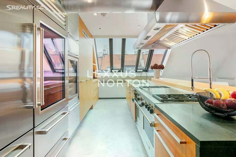 Nabízíme prostorný mezonetový byt o dispozici 4+kk s jižně orientovanou terasou a kouzelným výhledem na věže a střechy Starého Města. Byt se nachází v nejvyšších patrech elegantního secesního domu, jen pár kroků od Pařížské ulice a také nábřeží Vltavy. Výjimečná část Starého města, která si dodnes zachovala své kouzlo a dopřává Vám pěší pohyb v centru metropole. Po vstupu do bytu v 6. nadzemním podlaží vás přivítá prostorný a světlý obývací pokoj s otevřeným konceptem kuchyně a jídelny. Prostor je velmi dobře rozvržený, prosvětlený jak z ulice, tak z vnitrobloku. Dominantou je designová kuchyň z nerezové oceli s ostrůvkem, která je vybavena špičkovými spotřebiči značky Sub-Zero, americkou lednicí, plynovým sporákem od Wolf. Velkoformátová hliníková okna přinášejí do interiéru dostatek přirozeného světla a elegantně propojují hlavní obytný prostor s terasou, která je ideálním místem pro ranní kávu či večerní posezení s osvětlenou věží Staroměstské radnice. Na vstupním patře se dále nachází koupelna s sprchovým koutem a toaletou. Po jednoramenném schodišti se sestoupíte do nižšího podlaží, kde se nacházejí tři samostatné pokoje. Hlavní ložnice o velikosti 33 m2 má vlastní koupelnu a balkon orientovaný do tichého vnitrobloku. Další dva pokoje jsou orientované do ulice Bílkova a větší z nich má balkon s výhledem až k Pařížské ulici. Na patře se nachází další koupelna s vanou i toaletou, hala s vestavěnými skříněmi a technická místnost. Velmi zajímavým prvkem je stylová knihovna z masivního dřeva přes dvě patra, která interiéru dodává osobitý charakter. Interiér bytu byl navržený a realizovaný renomovaným studiem Dolnic v roce 2010 a i v dnešní době může stále nabídnout velmi kvalitní zázemí. Prostor bytu harmonicky propojuje původní secesních prvky budovy s moderními a nadčasovými materiály vysoké kvality. Masivní dřevěné podlahy, mramor, vestavěný nábytek na míru, posuvné dveře přes celou stěnu na terasu apod. Secesní budova s výtahem odráží noblesu počátku 20. století a skvěle doplňuje atmosféru samotného bytu. Milovníci městského života ocení širokou nabídku kaváren, restaurací, butiků a galerií, zatímco ti, kdo hledají klid, mohou zamířit do nedalekých zahrad Anežského kláštera. Dopravní dostupnost je vynikající - v pěší vzdálenosti se nachází stanice metra linky A i tramvajové zastávky Právnická fakulta.