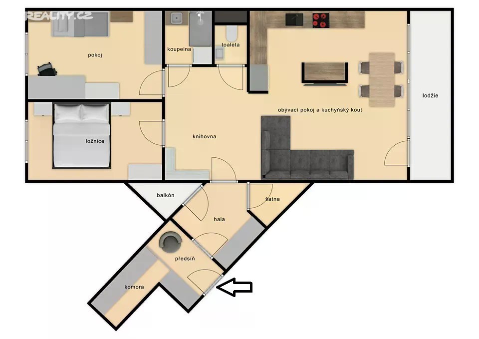 Nabízíme k prodeji prostorný družstevní byt 3+kk o ploše 90 m² se dvěma lodžiemi o celkové ploše 10 m² v ulici Kettnerova, Praha 13 - Stodůlky, přímo u Centrálního parku. Byt se nachází v 9. patře dvanáctipodlažního panelového domu po kompletní rekonstrukci, pouhé dvě minuty chůze od metra B - Luka a obchodního centra Luka. Byt prošel důkladnou rekonstrukcí a je ve výborném technickém stavu. Byt je ve družstevním vlastnictví, financování hypotečním úvěrem je možné se zajištěním jinou nemovitostí. Alternativně lze vyměnit za menší byt kdekoliv v Praze a okolí. Nabídněte! Dispozice bytu: Vstupní předsíň nabízí velkou šatní skříň a praktickou komoru s přívodem denního světla, která může sloužit i jako domácí dílna nebo malá pracovna. Na předsíň navazuje hala s prostornou šatnou a vstupem na lodžii (3 m²), která směřuje na východ. Ze vstupní haly vstupujeme do obytné části bytu, která působí velmi prostorným dojmem. Je to díky otevřenému prostoru, který vznikl po odstranění původní komory. Vznikl tak zajímavý kout, který se přirozeně napojuje na obývací pokoj a vytváří velmi příjemnou atmosféru. Je zde místo na knihovnu a pohodlné posezení. Obývací pokoj s kuchyňským koutem je orientován na severozápad do zeleného vnitrobloku. Kuchyňská linka je plně vybavena vestavěnými spotřebiči, má velkou pracovní plochu a dostatek úložných prostor. Velké okno zajišťuje přirozené denní světlo v kuchyni až do večerních hodin. Jídelní kout u okna pomyslně odděluje kuchyň od obývací části. Z obývacího pokoje je vstup na velkou zasklenou lodžii (7 m²) s výhledem do klidného zeleného vnitrobloku. Na druhé straně obytné zóny se nachází vstup do obou ložnic. Okna všech pokojů směřují na jihovýchod s výhledem na široké okolí, Stodůlky a Centrální park. Koupelna je vybavena na míru vybudovaným sprchovým koutem, umyvadlem a prostorem pro pračku. Toaleta s umyvadlem je samostatná. Veškerý vestavěný nábytek v bytě, včetně kuchyňské linky a šatních skříní, je vyroben na míru a je součástí prodeje. Byt je vybaven klimatizací s možností ohřevu. Díky své poloze, kvalitní rekonstrukci a vybavení je byt velmi světlý, prostorný a úsporný. Měsíční náklady bez příspěvku do fondu oprav (ve výši 3 923 Kč) po započtení ročního přeplatku činí pouze 5 153 Kč. V tomto patře jsou pouze dva byty, což zajišťuje mimořádně klidné bydlení. Na patře je zároveň přístup do vedlejšího vchodu s druhým, záložním výtahem. K bytu náleží sklepní kóje (cca 2 m²) umístěná o jedno patro výš. Dům je po kompletní rekonstrukci - nová fasáda, střecha, výtah i společné prostory - a je velmi dobře spravován. Výhody bytu: • Velmi prostorný a světlý byt • Kompletní rekonstrukce bytu i domu • Vestavěný nábytek na míru, dvě lodžie, klimatizace • 2 minuty od metra, OC Luka a Centrálního parku • Možnost výměny za menší byt Celkově byt působí velmi příjemným dojmem a díky velkému množství šaten, komor a vestavěného nábytku na míru je prostornější než panelové byty se standardní dispozicí. Byt je ve družstevním vlastnictví, což zaručuje klidnější a komornější styl bydlení mezi sousedy - převážně „starousedlíky“. Financování hypotečním úvěrem je možné se zajištěním jinou nemovitostí. Lokalita nabízí veškerou občanskou vybavenost - školy, školky, obchody, služby i zdravotnická zařízení - vše v pěší vzdálenosti. V bezprostřední blízkosti domu se nachází Centrální park Stodůlky. Byt je skvělou volbou pro ty, kdo chtějí bydlet právě ve Stodůlkách a nespokojí se se standardním panelovým bytem. Majitel si vyhrazuje právo prodat nemovitost nejvýhodnější nabídce. Uvedené informace mají pouze informativní charakter a mohou se v průběhu inzerce změnit.