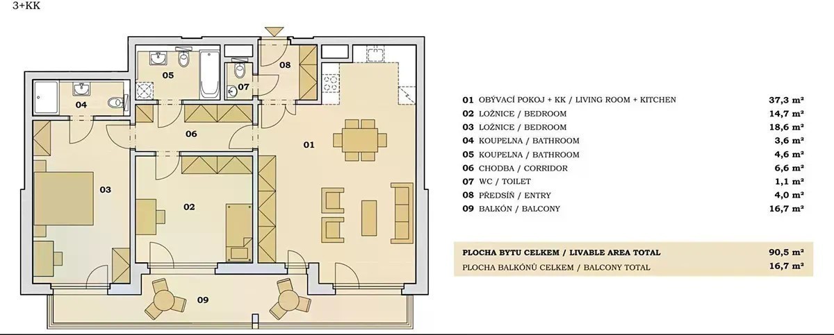 Nabízíme k pronájmu jižně orientovaný byt 3+kk o velikosti 91 m2 + terasa 17 m2. Byt se nachází ve 3. podlaží (z pohledu parku) rezidenčního projektu Kajetánka na Praze 6 v Břevnově. V bytě se nachází prostorný obývací pokoj s plně vybaveným kuchyňským koutem, prostorná chodba, dvě ložnice, dvě koupelny a samostatná toaleta. Ze všech místností je vstup na prostornou terasu. Byt je vybavený nábytkem. Všechna okna v bytě jsou francouzská a jsou orientovaná do krásného parku Kajetánka. Veškerá občanská vybavenost v místě. Klidná lokalita plná zeleně s dobrou dostupností do centra i na letiště. K bytu náleží parkovací stání v podzemních garážích a sklep. Nájemné 46 000 měsíčně + zálohy na služby + elektřina. Energetická náročnost budovy B velmi úsporná. Neváhejte nás kontaktovat pro více informací. Doporučujeme prohlídku. Ihned k dispozici. Majitel si vyhrazuje právo vybrat si zájemce dle vlastních kritérií.