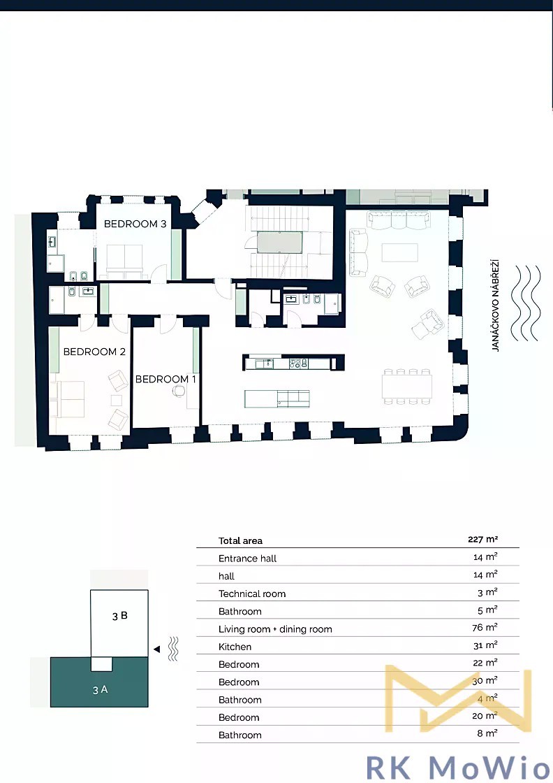 Na pronájem nabízíme zrekonstruovaný byt č. 3B bez nábytku, 4+kk s podlahovou plochou 227 m2, situovaný ve 2. patře (3. nadzemní podlaží) secesní budovy s výtahem na Janáčkově nábřeží, v atraktivní lokalitě Prahy 5 - Smíchov. Bytová jednotka nabízí vstupní halu, prostorný obývací pokoj s jídelním prostorem a kuchyňským koutem, hlavní ložnice s vlastní koupelnou (se sprchou, umyvadlem, bidetem a toaletou), druhou ložnici se soukromou koupelnou (se sprchou, umyvadlem a toaletou), třetí ložnici, 1 koupelnu (se sprchou, umyvadlem, bidetem a toaletou) a technickou místnost. Vybavení bytu: moderní kuchyňská linka včetně lednice s mrazákem, indukční varné desky, digestoře, myčky, elektrické a mikrovlnné trouby, vestavěné skříně, pračka, sušička, inteligentní ovládání domácnosti, video telefon, bezpečnostní dveře, špaletová okna, dubové parkety a dlažba. Garážové stání za extra příplatek 10.000.- Kč/měsíc plus 21% DPH = 12.100,- Kč/měsíc. Měsíční nájemné činí 156.450,- Kč/měsíc plus poplatky 29.510,- Kč/měsíc (domovní služby), převod elektřiny a plynu na nájemce. Požadovaná jistota (kauce) ve výši dvou měsíčních nájmů.