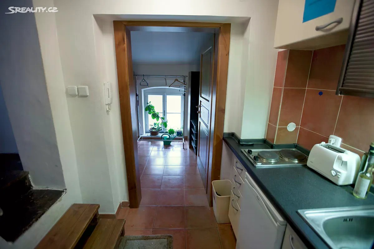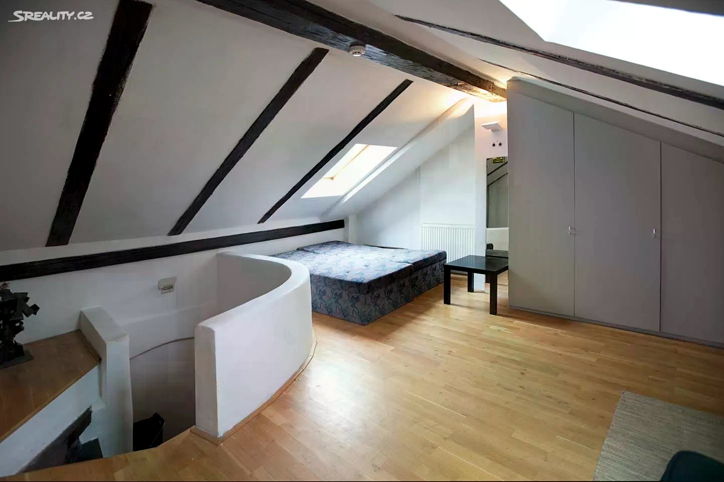 Mezonetový podkrovní byt (řešený jako 1+1 plus vstupní předsíň ) v historickém centru Prahy na Starém Městě u Vltavy blízko Karlova mostu pro dlouhodobý pronájem 1 osoby, nekuřák (domácí zvířata nejsou povolena). Schodištěm je přístupný střešní pokoj. V přízemí je malá kuchyň s lednicí, el. vařičem, dřezem, koupelna se sprchou, umývadlem a WC, podkrovní pokoj je vybaven vestavěnou skříní, dvoj postelí, s kvalitní matrací, stolkem aj. Byt je přístupný přes společnou předsíň (z předsíně je vstup i do ateliéru majitele bytu), kde je k dispozici pračka, věšák aj. Vytápění etážové včetně teplé vody, dlažba, parkety, internet zaveden-aktivuje a platí nájemce, dvě okna velux.