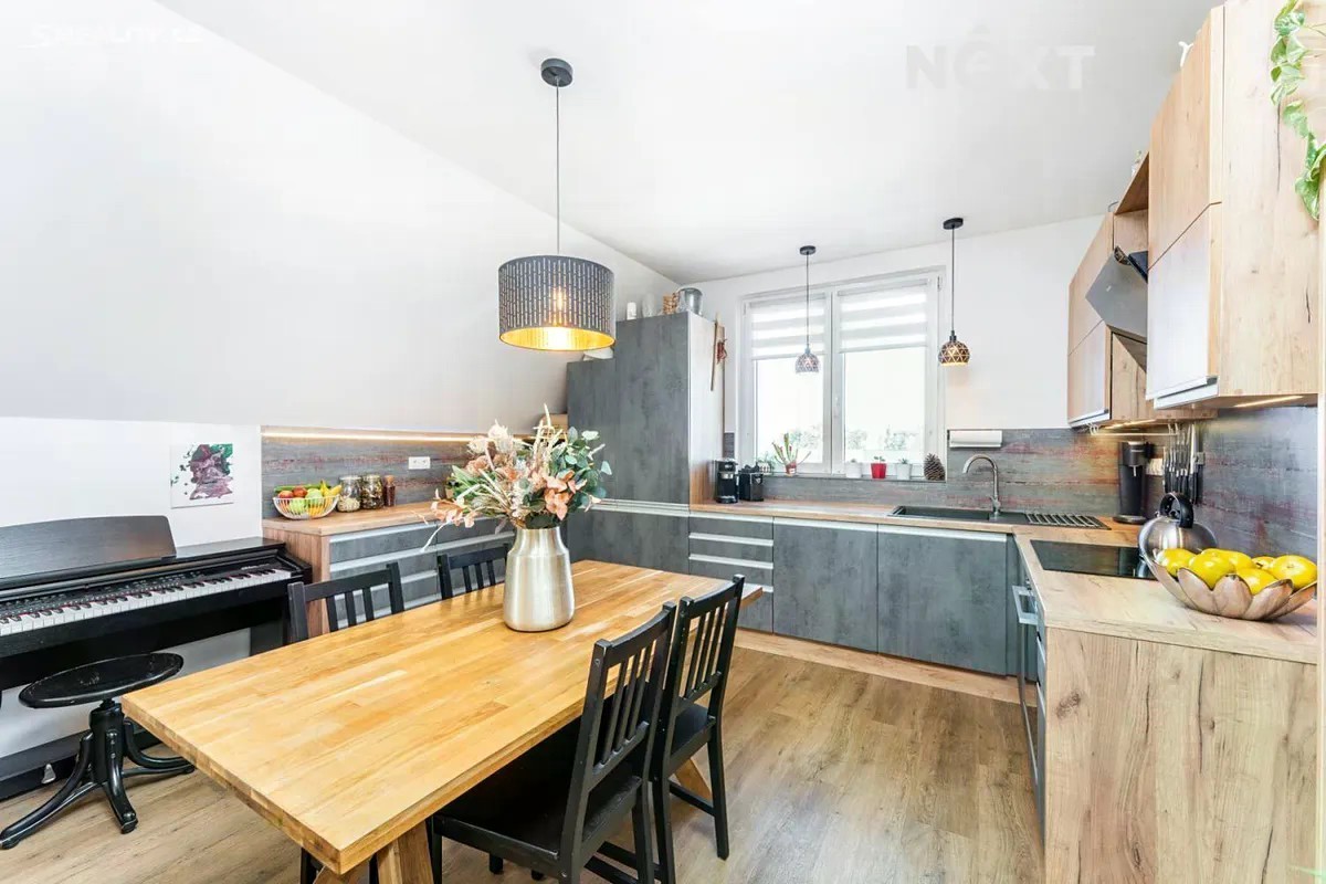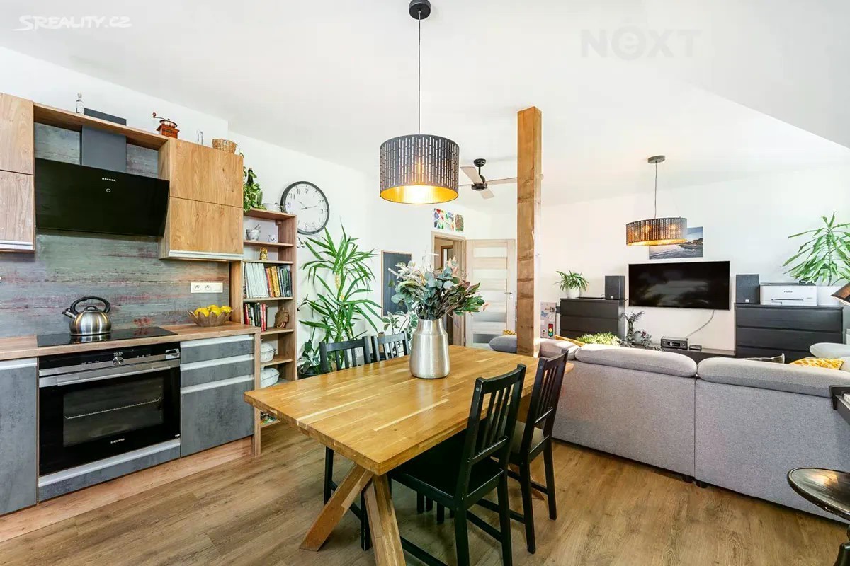 Představujeme vám ke koupi světlý a prostorný byt o dispozici 4+kk (původně 3+1), nacházející se ve 3. nadzemním podlaží bytového domu se společnou zahradou se čtyřmi jednotkami v obci Větrušice u Prahy. Byt po kompletní rekonstrukci má aktuální plochu bez balkónu a sklepu cca 100 m² (dle prohlášení vlastníka je podlahová plocha 96,3m2). Součástí bytu je také balkon o ploše cca 5,2m2. Z balkónu je krásný výhled do zeleně a také vás jistě potěší velkorysý sklep o ploše přes 9 m². Jedno parkovací místo je na základě dohody přímo na pozemku a další možnost parkování je na ulici před domem či na kraji ulice vedoucí k sadu. K bytu dále náleží vlastní pozemek o ploše 40m2 se stávající stavbou bez č.p., na kterém je připraven nový projekt krásného zahradního domku. Aktuálně je projekt ve schvalovacím procesu. Jedná se o obrovskou výhodu, která nabízí další prostor k využití. Využití bude čistě jen na Vás - zahradní domek se hodí např. pro zahradničení, vlastní dílnu nebo uskladnění věcí. Byt prošel v roce 2020 kompletní rekonstrukcí provedenou s citem pro detail a kvalitu. Při rekonstrukci vznikl i výrazný estetický prvek v podobě přiznaného trámu v obývacím pokoji, který prostoru dodává jedinečnou atmosféru. Dispozice nabízí obývací pokoj s kuchyňským koutem a jídelnou, ložnici s vlastní šatnou a vstupem na balkón a dva samostatné pokoje. Samozřejmostí je koupelna s prostorným sprchovým koutem a samostatná toaleta. Velkou výhodou je prakticky umístěná technická místnost v rohu bytu, která chytře využívá prostor a výrazně tak rozšiřuje úložné možnosti. Byt je tak nejen esteticky povedený, ale i funkčně velmi dobře řešený. Vytápění je ústřední, plynovým kotlem umístěným v domě. Dům je napojen na všechny inženýrské sítě - veřejný vodovod, kanalizaci, elektřinu a plyn. Z okna jednoho z pokojů se skýtá nádherný výhled na řeku Vltavu a České Středohoří, z ostatních oken i balkonu si můžete užívat klidu a okolní zeleně. Byt nabízí klidné a pohodové bydlení v blízkosti přírody. Obec Větrušice leží u přírodního parku Dolní Povltaví, odkud se skýtají nádherné výhledy na řeku a okolní krajinu. Větrušice jsou neprůjezdnou obcí bez dopravního ruchu, zároveň však s vynikající dostupností do Prahy - autem, pravidelnými spoji MHD (20 min na metro Kobylisy) i po cyklostezce. V obci se nachází potraviny, dětská skupina podporovaná obcí a dvě dětská hřiště - z toho jedno na dohled z okna obývacího pokoje. Sousední Klecany nabízí další občanskou vybavenost - školu, školku, ZUŠ, obchody, lékaře, restaurace, kavárny, posilovnu apod. Nejbližší supermarket (LIDL) se nachází cca 7 min autem. Toto místo je ideální pro rodinu s dětmi nebo pro ty, kteří hledají klidné, prostorné a komfortní bydlení v bezprostředním dosahu hlavního města. Těším se na prohlídky. Pro komunikaci uvádějte evidenční číslo zakázky N114363.