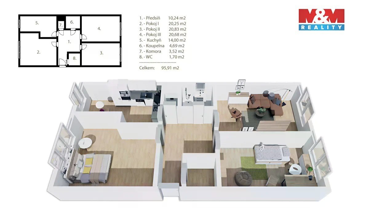 Nabízíme k prodeji prostorný byt 3+1 o celkové užitné ploše 95,91 m² v jedné z nejžádanějších lokalit lázeňského města Poděbrady, jen pár kroků od kolonády. Byt se nachází v 1. patře udržovaného zděného domu z roku 2007 a nabízí komfortní a klidné bydlení s výbornou dostupností do centra města. Dispozičně byt zahrnuje vstupní chodbu s praktickou komorou, tři prostorné pokoje (jeden s vestavěnou skříní), kuchyň s plně vybavenou linkou, koupelnu s vanou a samostatnou toaletu. Vytápění i ohřev vody jsou zajištěny dálkovým rozvodem, což přináší nízké provozní náklady a pohodlí. K bytu náleží zastřešené parkovací stání, což je v této lokalitě velkou výhodou. V okolí je veškerá občanská vybavenost, obchody, školy, restaurace, kavárny i lázeňský park s kolonádou. Byt je ideální pro rodiny i pro ty, kdo hledají pohodlné a elegantní bydlení v srdci Poděbrad. Koupi je možné financovat hypotékou, pro kterou vám rádi zařídíme nabídku s výhodnou úrokovou sazbou.