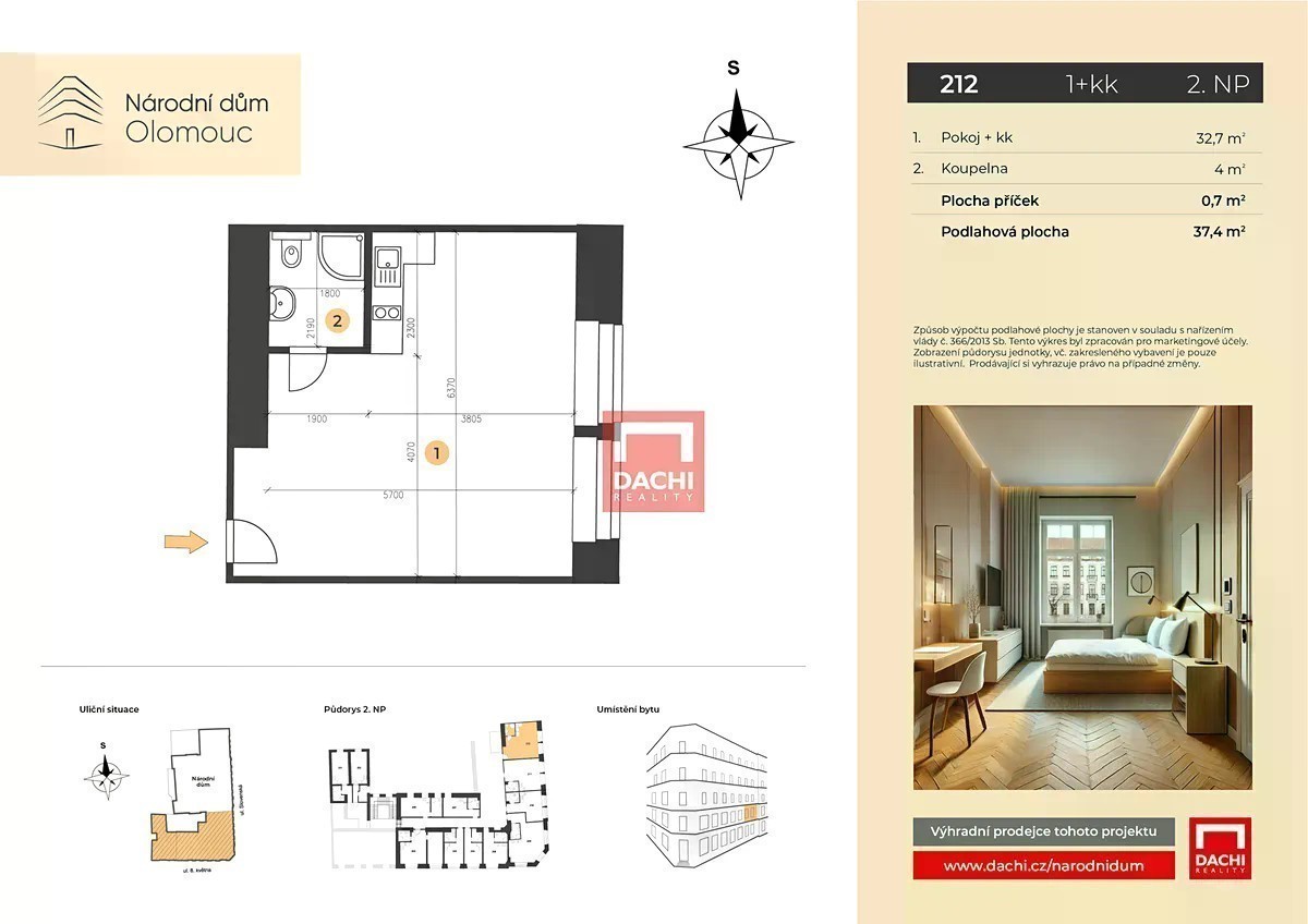 Nabízíme vám jako výhradní prodejce jedinečnou příležitost stát se součástí unikátního rezidenčního projektu, který vdechuje nový život architektonicky cenné budově historického Národního domu v Olomouci. Tento ikonický dům vstupuje do nové éry - v jeho prostorách vznikají desítky moderních bytových jednotek, které citlivě propojují historické kouzlo s komfortem současného bydlení. V rámci projektu nabízíme byt č. 212 o dispozici 1+kk s podlahovou plochou 37,4m², který se nachází ve 2. nadzemním podlaží. Byty jsou navrženy s důrazem na kvalitu, eleganci a funkčnost - samozřejmostí jsou kvalitní podlahy, designové interiérové prvky a moderně vybavené koupelny. Všechny byty ve 2. nadzemním podlaží disponují velkými okny, které interiér zaplavují denním světlem a nabízejí působivý výhled na dění v centru města. Pod okny jsou umístěny stylové dřevěné kryty radiátorů s mřížkami, které zároveň vytvářejí příjemné posezení - ideální místo pro odpočinek s knihou, ranní kávu nebo pozorování pulzujícího života historické Olomouce. Historický Národní dům byl od svého vzniku dějištěm významných společenských a kulturních událostí, jichž se účastnily přední osobnosti českých dějin, včetně T. G. Masaryka. Díky tomu má celý objekt nezaměnitelnou atmosféru a historický odkaz, který dodává novému bydlení jedinečný charakter. K výjimečné atmosféře domu přispívá také stylová kavárna a restaurace v přízemí, které vytvářejí příjemné zázemí nejen pro rezidenty, ale i jejich hosty. Díky prestižní poloze v samotném centru města, v těsné blízkosti památek, oblíbených restaurací a kulturních institucí, představuje projekt nejen komfortní místo pro život, ale také mimořádně atraktivní investiční příležitost. Hledáte-li byt s jedinečným charakterem v historickém domě, kde se noblesní atmosféra minulosti snoubí s moderním stylem života, neváhejte nás kontaktovat. Rádi vám projekt osobně představíme.