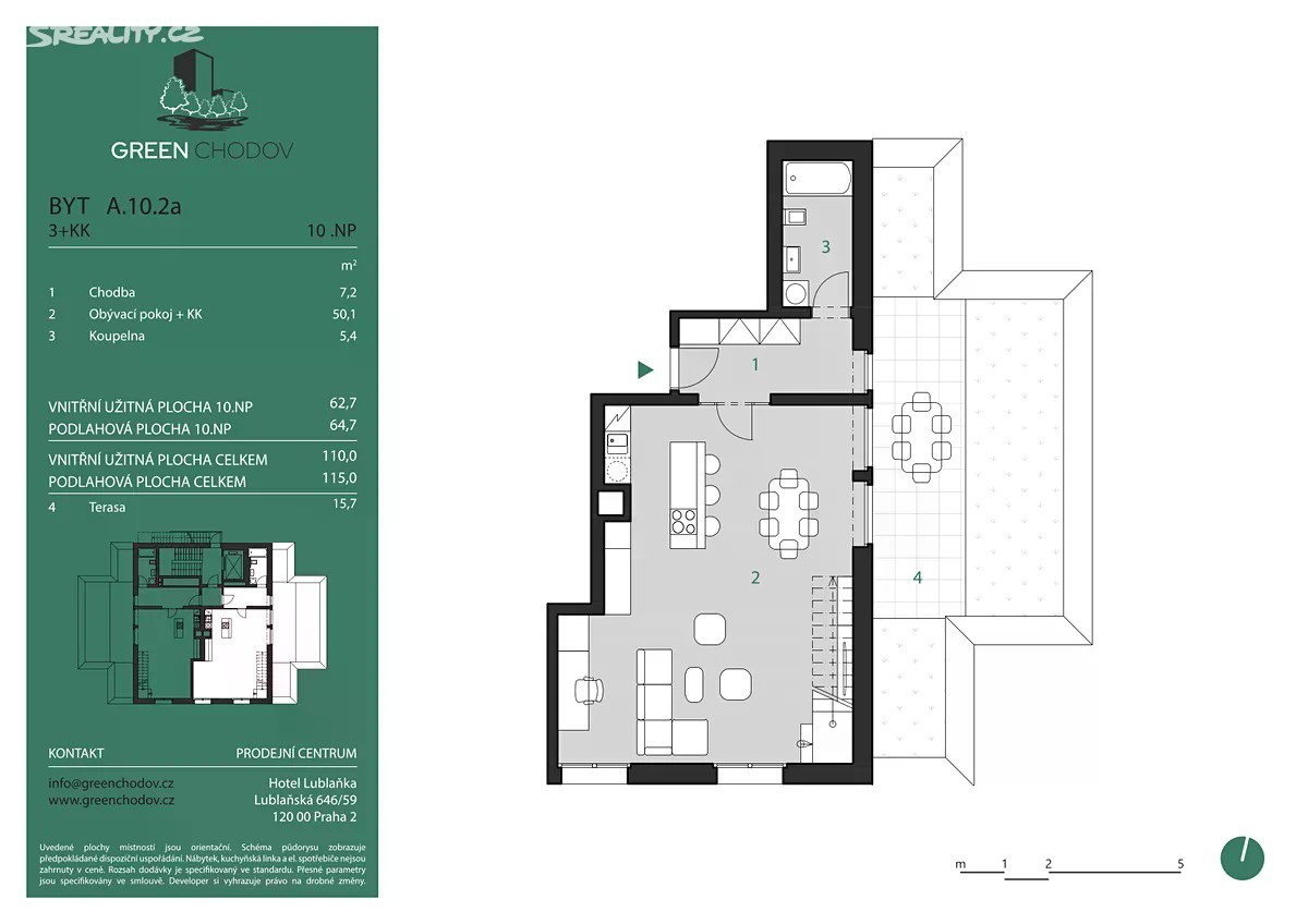 Green Chodov: Exkluzivní bydlení a investice v Praze. Představujeme vám rezidenční projekt Green Chodov, který nabízí moderní bydlení v atraktivní a klidné lokalitě Prahy. Projekt je navržen tak, aby spojoval komfort městského života s harmonií přírody. Luxusní mezonetový byt 3+kk v 10. a 11. patře nabízí prostorné a moderní bydlení ve dvou podlažích. V dolním patře se nachází vstupní chodba, koupelna a velký obývací pokoj, který přímo navazuje na impozantní terasu se zelenou střechou a pochozí dlažbou. Terasa poskytuje soukromé venkovní posezení i jedinečný výhled na Prahu. Elegantní vnitřní schodiště propojuje obě patra. Horní patro tvoří prostorná chodba, druhá koupelna a ložnice s vlastní zastřešenou lodžií. Ta ložnici dodává nejen soukromí, ale i další krásné místo k posezení s působivým panoramatem metropole. Byt spojuje komfort, moderní design a dechberoucí výhledy, čímž vytváří exkluzivní bydlení v srdci města, obklopené přírodou. Mimořádná lokalita a skvělá dostupnost. Green Chodov se nachází na pražském Chodově s rychlým a pohodlným přístupem do centra města. Přímo u projektu jsou dvě autobusové zastávky a metro je v docházkové vzdálenosti na stanicích Chodov a Roztyly. V budoucnu se plánuje také tramvajová trať, což dostupnost ještě vylepší. Navíc v pěší vzdálenosti najdete velký supermarket i nákupní centrum Westfield Chodov. Kvalitní bydlení i investiční příležitost. Projekt se skládá z 11podlažního bytového domu a 2podlažního polyfunkčního domu se společným podzemním parkováním. V nabídce jsou různé typy bytů, od malometrážních až po prostorné mezonetové byty, a také komerční a kancelářské prostory. Díky promyšlené dispozici je projekt atraktivní jak pro bydlení, tak pro investory hledající pasivní příjem z pronájmu či kapitálové zhodnocení. Příroda a klid na dosah ruky. Projekt je obklopen zelení a krásným vodním jezerem, které slouží jako ideální místo pro relaxaci. V blízkosti se nachází i park Trojmezí, jeden z největších přírodních parků v Praze. Nominace na ocenění a transparentní přístup. Rezidenční projekt Green Chodov byl nominován na ocenění Realitní projekt roku 2025 díky jedinečnému spojení architektury, přírody a vynikající dostupnosti. Za projektem stojí rodinný developer, pro kterého je prioritou kvalita, promyšlenost a spokojenost budoucích obyvatel. Nepropásněte tuto příležitost. Kontaktujte nás a zjistěte více o tomto exkluzivním projektu.
