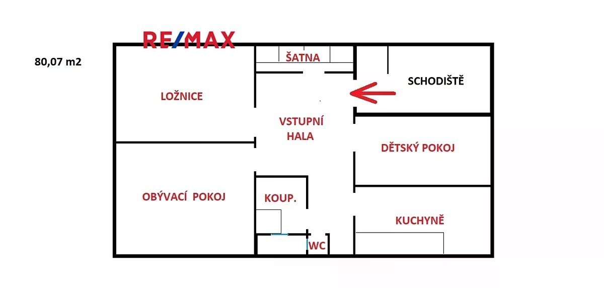 Nabízíme k prodeji bytovou jednotku dispozičně řešenou 3+1 80 m2 s balkónem u kuchyně, zděným sklepem a společnou zahradou (dvorkem) za domem. Bytová jednotka se nachází v klidné části obce v 5. podlaží (4. patře) bytového domu bez výtahu. Z prostorné vstupní haly jsou samostatné vchody do všech místností. Kuchyně s balkónem a dětský pokoj jsou situovány do vnitrobloku (západ), obývací pokoj a ložnice do ulice (východ). Koupelna i samostatná toaleta mají okno do světlíku a je zde velmi dobré odvětrání. Velkou předností je samostatná šatna se čtyřmi vestavěnými skříněmi s nástavci až do stropu. Voda obecní, vytápění dálkovým přístupem. V domě se nachází pouze čtyři bytové jednotky. V přízemí domu je zděný sklep 3 m2 a společná kolárna. Parkování na ulici. V blízkosti je veškerá občanská vybavenost, MHD trolej, tram a bus. V blízkosti vlaková zastávka.