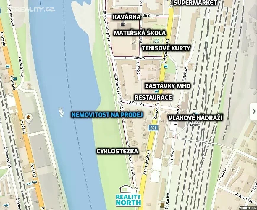Naše společnost Vám zprostředkuje prodej bytové jednotky v osobním vlastnictví o dispozici 3+1, který se nachází v klidné a vyhledávané lokalitě města Ústí nad Labem, Střekově, ulice Střekovské nábřeží. Nemovitost je situována v 1.NP cihlového domu. Byt je ve velmi udržovaném stavu, kuchyňská linka s elektrickým sporákem a troubou. Koupelnové jádro je zděné s rohovou vanou, umyvadlem a WC. Ve dvou pokojích jsou instalovány zatemňovací rolety, ve všech místnostech jsou plastová okna. Byt má bezpečnostní dveře. V celém bytě je položena dlažba, v jednom pokoji je funkční podlahové vytápení. Rozvody elektrické energie jsou v mědi, digitální měráky topení, odpad v plastu. Možnost využití kabelové televize a internetu. Nemovitost je orientována na východní a západní světovou stranu. V domě je úklidová služba. Nová střecha, zánovní schránky. Možnost využití zahrádky za domem, sušárny, kočárkárny. K bytu náleží prostorná zděná sklepní koje. Vřele doporučujeme prohlídku.