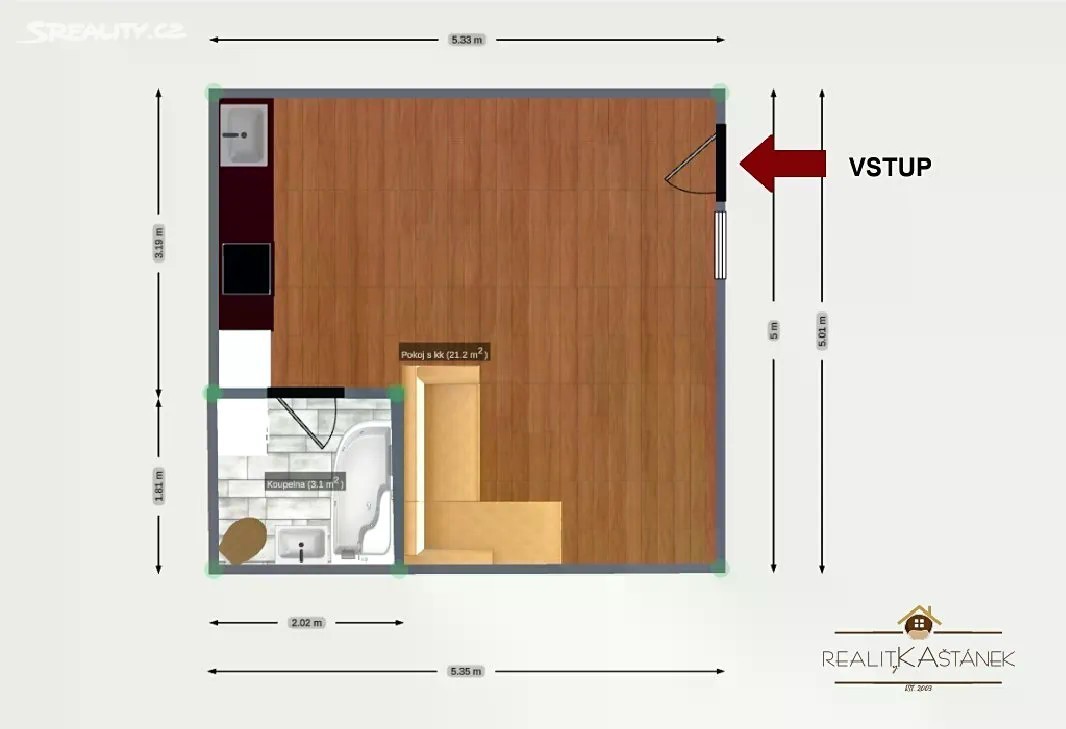 Udržovaná garsoniéra v rodinném domě nedaleko centra města. TECHNICKÉ ATRIBUTY: 25 m2 | 1 pokoj s kuchyňským koutem | 1. PP PŘÍSLUŠENSTVÍ | VYBAVENÍ: Plovoucí podlahy, praktická dlažba v kuchyni, původní kuchyňská linka, elektrický plotýnkový sporák, mikrovlnná trouba, lednice, pračka. Dřevěné okno + žaluzie, prosvětlené vstupní dveře. Koupelna s vanou a wc. INFORMACE K DOMU | NEMOVITOSTI | ZAHRADĚ: Bytová jednotka v rodinném domě, vlastní nezávislý vstup. LOKALITA: Vyhledávaná lokalita v klidné části Liberce, pouhých 5 minut pěšky do centra města. V okolí množství vzrostlé zeleně, nedaleko cyklostezka, ekopark a stadion u Nisy. Výborná dostupnost všech služeb včetně MHD. CENA: Nájemné: 7.500,- Kč. Služby: 3.780,- Kč. Jistota: 11.500,- Kč + provize RK. VOLNÉ: Ihned. DOPORUČENÍ PRO PROHLÍDKY: Do e-mailu adresovanému kanceláři napište Vaše jméno, telefon a e-mail. Nezapomeňte na identifikaci nemovitosti - adresa popř. číslo zakázky. S konkrétním termínem prohlídky se Vám co nejdříve ozveme.