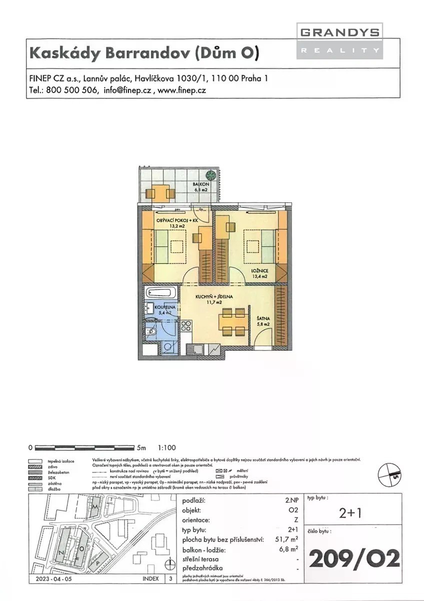 Nabízíme prodej bytu v osobním vlastnictví o dispozici 2+1 s užitnou plochou 58,5 m² (včetně balkonu 6,8 m2). Jedná se o cihlovou novostavbu bytového domu "O" v rezidenci Kaskády Barrandov, Praha 5 - Hlubočepy. V současné době probíhá výstavba, termín dokončení je stanovený na jaro roku 2026. Byt se nachází ve 2. nadzemním podlaží domu s výtahem (šest nadzemních podlaží celkem a dvě podzemní). Součástí bytu je balkón o ploše 6,8 m². Vytápění bytu je zajištěno ústředním topením s otopnými deskovými tělesy s termostatickou hlavicí, v koupelně topný žebřík. V obytné místnosti jsou rozvody pro datové služby a kabelovou televizi. Dům je vybaven čipovým systém u vstupu do objektu a u společných prostor domu. Bezbariérový přístup. Energetický štítek budovy kategorie B - bude doplněn. Cena bytu při podpisu postoupení budoucí kupní smlouvy 3 118 714 Kč. Následný doplatek po kolaudaci 5 181 286 Kč. Cena zahrnuje vstupní bezpečnostní protipožární dveře, zařizovací předměty v koupelně (umyvadlo a závěsné WC značky Laufen, podezděná vana, topný žebřík), podlahové krytiny (možnost výběru), moderní interiérové dveře SAPELI, přípravu pro venkovní žaluzie. Cena nezahrnuje kuchyňskou linku - pouze centrální příprava pro napojení rozvodů. K bytu je možné přikoupit jedno garážové stání v 2. podzemním podlaží domu za 899 000,- Kč. Cena parkovacího stání při podpisu postoupení budoucí kupní smlouvy 549 000 Kč. Následný doplatek po kolaudaci 350 000 Kč. V okolí veškerá občanská vybavenost (poliklinika, obchody, pošta, základní a mateřská škola, plavecký komplex AquaDream). Výborná dopravní dostupnost - 12 minut tramvají na Smíchovské nádraží a 24 minut tramvají na Václavské náměstí, 20 minut jízdy na letiště Václava Havla. Výhodou této lokality je bezprostřední návaznost na velké plochy zeleně s cyklostezkami a lesními cestami. Přírodní rezervace Prokopského údolí se nachází v docházkové vzdálenosti. Pro více informací a sjednání termínu prohlídky kontaktujte makléře.