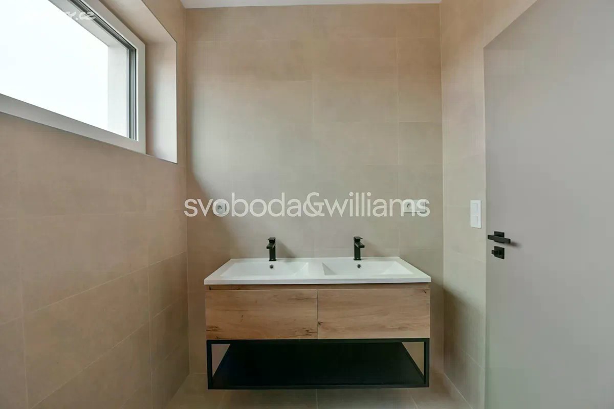 Nabízíme k pronájmu nový nezařízený byt se 2 terasami a 2 koupelnami ve 2., nejvyšším patře v nově postavené budově s výtahem, která je součástí rezidenčního komplexu s parkováním. Dům stojí v klidné rezidenční zástavbě v obci Roztoky s plnou občanskou vybaveností a dobrou dostupností do Prahy, cca 15 min. autem od stanice metra Dejvická. Výborná je také dostupnost na letiště a do mezinárodních škol v Praze 6 - ISP, Riverside School a Park Lane. Bezprostřední okolí nabízí mnoho možností aktivního odpočinku a relaxace, turistické a cyklistické stezky v chráněné přírodní rezervaci Roztocký háj či v údolí Únětického potoka. Interiér tvoří obývací pokoj s plně vybavenou kuchyní, jídelním prostorem a přístupem na obě terasy, 3 ložnice s francouzskými okny, 2 koupelny (vana, toaleta / sprchový kout), samostatná toaleta a vstupní hala s vestavěnými skříněmi. Rekuperace, vinylové podlahy v ložnicích, dlažba, elektricky ovládané předokenní žaluzie, centrální vytápění, podlahové topení v celém bytě, myčka, indukční varná deska, mikrovlnná trouba, sklep. V ceně je zahrnuto jedno garážové stání a jedno parkovací stání na pozemku.