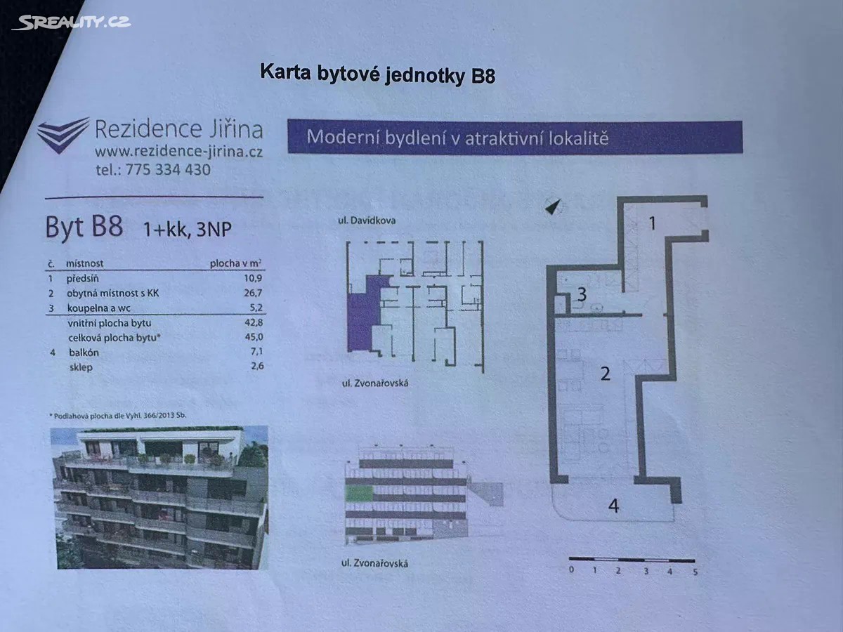 Slunný byt 1+kk s balkonem v cihlovém domě a skvělou dostupností do centra. Klíčové informace: - Dispozice: 1+kk - Užitná plocha bytu: 43 m² - Terasa: 7 m² - Sklep: 3 m² - Umístění: 3. patro (cihlový dům, kolaudace 2017) - Vlastnictví: osobní - Stav: novostavba - Nábytek a kvalitní vybavení je zahrnuté v ceně - PENB: B - velmi úsporné - Kolárna v přízemí - Případná možnost pronajmout parkovací stání - Nízké měsíční náklady - 4 500 Kč/měsíc - Termostat pro nastavení mikroklimatu v bytě Co vás na něm nadchne? * Dům byl postaven z prémiových materiálů - v zimě prakticky není nutné topit, v létě je v bytě příjemně chladno * Díky kvalitní výstavbě má byt výbornou tepelnou i zvukovou izolaci * Možnost regulace klimatu v bytě pro váš maximální komfort * Byt je orientován do klidné části s krásným výhledem na rozlehlou zelenou část Prahy - na obzor vystupuje Vítkov, Vyšehrad, Staré Město, Národní muzeum i Petřín * Prostorná terasa ideální na ranní kávu nebo večerní relax * Byt je v perfektním stavu - bez nutnosti dalších investic * Praktický sklep pro uskladnění sportovního vybavení nebo sezónních věcí * Klidné bydlení v pečlivě udržovaném cihlovém domě Lokalita, která má všechno: * Dva vchody do domu - z hlavní ulice Davídkova a z parkoviště. Součástí domu je 6 parkovacích míst přímo před domem * Autobusová zastávka jen 2 minuty chůze * Metro C - Ládví do 10 minut pěšky * Tramvajová zastávka Bulovka dostupná za 7 minut * Do centra města se dostanete tramvají za pouhých 15 minut * Do 10 minut autobusem jste na vlakovém nádraží Nádraží Holešovice * V pěší dostupnosti (cca 5 minut) se nachází přírodní památka Okrouhlík - ideální místo na procházky se psem nebo odpočinek s dětmi * Plná občanská vybavenost: obchody, OD Ládví, pošta, restaurace, lékárny, banky i zdravotnická zařízení