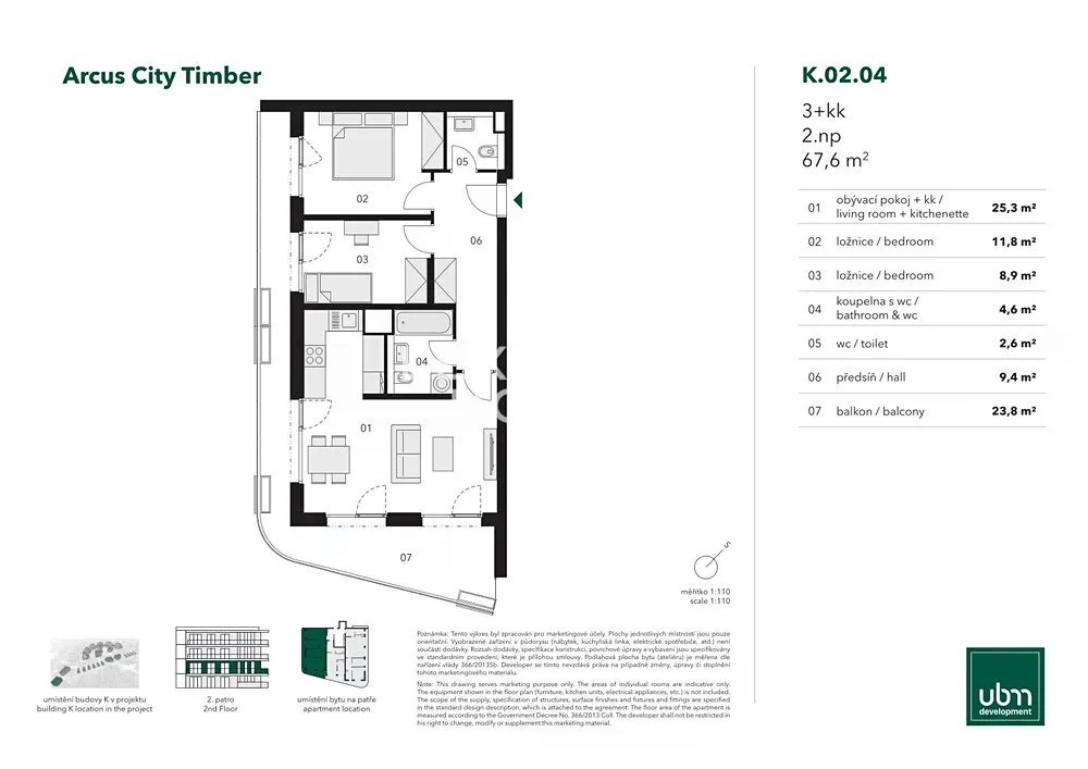 Tento prostorný byt v budově K o dispozici 3+kk a rozloze 68 m² je situován ve druhém nadzemním podlaží a nabízí výhled na jižní a západní stranu, což zajišťuje dostatek přirozeného světla během dne. Velký balkon o rozloze 24 m² je přístupný ze všech obytných pokojů, což umožňuje plynulý kontakt s venkovními prostory a vytváří ideální místo pro odpočinek nebo společenské okamžiky. Interiér je prostorný, světlý a prakticky řešený, vhodný pro rodiny i jednotlivce, kteří ocení kombinaci slunečného prostředí, komfortu a venkovního prostoru. Samozřejmostí je i přiřazené parkovací stání a sklep, které nejsou zahrnuty v ceně bytu. Díky realizaci domu v energeticky úsporné kategorii A splňuje přísné ekologické standardy certifikace BREEAM Excellent, což je záruka udržitelného bydlení na nejvyšší úrovni. Timber Praha, udržitelná dřevostavba bytového domu a zcela první projekt svého druhu v Praze. Vysoce kvalitní bydlení s dobrou energií, nadčasovým designem a kreativním duchem. Byt 3+kk k prodeji, který splňuje všechny uvedené benefity doplňuje kompletní občanská vybavenost a perfektní dostupnost do Prahy. Timber Praha je budoucnost bydlení s dobrou energií. Má řadu energeticky úsporných prvků, jako jsou fotovoltaické panely, tepelná čerpadla a geotermální vrty, díky nimž jsou šetrné k životnímu prostředí a zároveň energeticky soběstačné. Ke komfortu a efektivitě přispívají i exteriérové žaluzie, podlahové vytápění s možností chlazení v létě a topení v zimě a systém Smart Home, který reguluje vytápění, chlazení a měří spotřebu energií. Udržitelnost v kombinaci s inovativními technologiemi dělá z dřevostaveb nejen ekologickou, ale i moderní volbu bydlení. Projekt je zrealizován v rámci rezidenčního komplexu Arcus City, který se nachází v MČ Praze - Řeporyjích. Součástí projektu je nová zastávka autobusu spojující rezidenční areál se stanicemi metra B Stodůlky a Luka, což obyvatelům zajišťuje rychlé spojení do centra Prahy. V blízkosti najdete veškerou občanskou vybavenost. Školky, školy, obchody, sportoviště, restaurace i zdravotnická zařízení. Relaxovat můžete v nedalekém bioparku Řepora, Prokopském a Dalejském údolí.