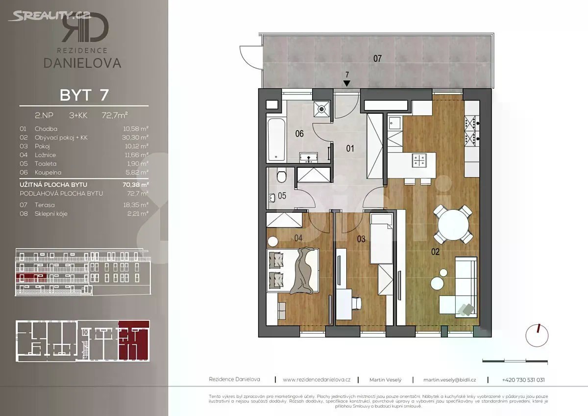 Dovolujeme si Vám nabídnout k prodeji byt 3+kk, 76 m2, s Terasou 15 m2, umístěné v 1. patře rezidenčního projektu Rezidence Danielova v samém srdci Čakovic. Kolaudace bytu plánována na říjen/listopad 2025 - koupelna s vanou, WC samostatně, příprava na kuchyňskou linku, okna plastová, příprava na venkovní elektricky ovládané žaluzie, designové radiátory, bezpečnostní vchodové dveře, na podlahách kvalitní vinylová podlaha a dlažba. K bytu náleží terasa 15 m2, jedno venkovní parkovací stání a sklep. Občanská vybavenost (MHD, školy, obchody, lékaři) v docházkové vzdálenosti. Byt je v OV - možné financovat pomocí hypotečního úvěru. V inzerátu jsou fotografie momentálního stavu bytu a vizualizace ilustrativního charakteru.