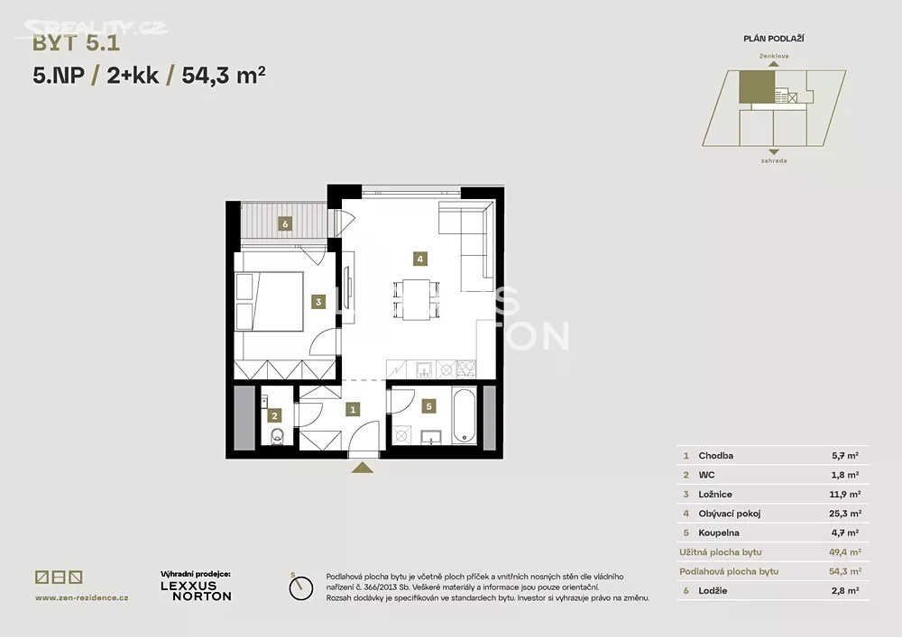 Nabízíme moderní byt 2+kk o celkové ploše 54,3 m², který se nachází v 5. nadzemním podlaží prestižního projektu ZEN Rezidence v pražské Libni. Tento byt s lodžií (2,8 m²) orientovanou na severní stranu a promyšlenou dispozicí nabízí ideální spojení pohodlí, funkčnosti a stylového bydlení v blízkosti centra města. Byt vás přivítá vstupní chodbou (5,7 m²) s dostatkem místa pro úložné prostory, která plynule přechází do hlavní obytné části. Tuto část tvoří prostorný obývací pokoj spojený s kuchyňským i jídelním koutem (25,3 m²) a přímým vstupem na lodžii, která je ideálním místem pro odpočinek. Na obývací pokoj navazuje ložnice (11,9 m²), která nabízí dostatek prostoru pro šatní skříně a zároveň přímý vstup na lodžii. K pohodlí bytu přispívá také koupelna s vanou a samostatná toaleta. Dokončení bytu ve vysokém standardu zahrnuje vinylové podlahy v dekoru dřeva, prémiové velkoformátové obklady a vybavení renomovaných značek SAT a GROHE. Izolační okna s trojskly zajišťují dokonalou tepelnou i zvukovou izolaci, zatímco řízené větrání s rekuperací tepla a příprava pro elektrické venkovní žaluzie přispívají ke komfortu bydlení. Bezpečnostní vstupní dveře třídy 3 poskytují maximální bezpečí. K bytu náleží sklepní kóje v podzemním podlaží. ZEN Rezidence představuje unikátní projekt, který kombinuje moderní architekturu, funkčnost a pohodlí pro nadstandardní bydlení. Rezidence disponuje reprezentativními společnými prostory, kočárkárnou a zázemím pro mytí kol, což přispívá k vyššímu komfortu budoucích rezidentů. Libeň je ideální čtvrtí pro ty, kteří hledají výbornou dostupnost centra města a zároveň klidné prostředí. Stanice metra Palmovka a tramvajové linky vás do 10 minut dopraví do srdce Prahy. V okolí rezidence najdete kompletní občanskou vybavenost - školy, školky, Fakultní nemocnici Bulovka, sportovní centra, restaurace, kavárny i obchody. Milovníci přírody ocení blízkost parku Pod Korábem, Proseckých skal či kouzelných procházek podél Vltavského nábřeží. Pokud hledáte moderní bydlení v atraktivní lokalitě, ZEN Rezidence je tou pravou volbou.