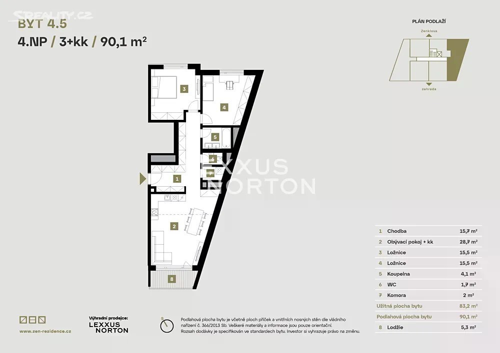 Nabízíme moderní byt 3+kk o celkové ploše 90,1 m², který se nachází ve 4. nadzemním podlaží prestižního projektu ZEN Rezidence v pražské Libni. Tento byt s lodžií (5,3 m²) orientovanou na jihozápadní stranu a promyšlenou dispozicí nabízí ideální spojení pohodlí, funkčnosti a stylového bydlení v blízkosti centra města. Byt vás přivítá vstupní chodbou (15,7 m²) s dostatkem místa pro úložné prostory, která plynule přechází do hlavní obytné části. Tuto část tvoří prostorný obývací pokoj spojený s kuchyňským i jídelním koutem (28,7 m²) a přímým vstupem na lodžii, která je ideálním místem pro odpočinek. Na opačné straně chodby navazuje dvě ložnice (15,5 m² a 15,5 m²), které nabízejí dostatek prostoru pro šatní skříně. K pohodlí bytu přispívá také koupelna s vanou a samostatná toaleta. Dokončení bytu ve vysokém standardu zahrnuje vinylové podlahy v dekoru dřeva, prémiové velkoformátové obklady a vybavení renomovaných značek SAT a GROHE. Izolační okna s trojskly zajišťují dokonalou tepelnou i zvukovou izolaci, zatímco řízené větrání s rekuperací tepla a příprava pro elektrické venkovní žaluzie přispívají ke komfortu bydlení. Bezpečnostní vstupní dveře třídy 3 poskytují maximální bezpečí. K bytu náleží sklepní kóje v podzemním podlaží. ZEN Rezidence představuje unikátní projekt, který kombinuje moderní architekturu, funkčnost a pohodlí pro nadstandardní bydlení. Rezidence disponuje reprezentativními společnými prostory, kočárkárnou a zázemím pro mytí kol, což přispívá k vyššímu komfortu budoucích rezidentů. Libeň je ideální čtvrtí pro ty, kteří hledají výbornou dostupnost centra města a zároveň klidné prostředí. Stanice metra Palmovka a tramvajové linky vás do 10 minut dopraví do srdce Prahy. V okolí rezidence najdete kompletní občanskou vybavenost - školy, školky, Fakultní nemocnici Bulovka, sportovní centra, restaurace, kavárny i obchody. Milovníci přírody ocení blízkost parku Pod Korábem, Proseckých skal či kouzelných procházek podél Vltavského nábřeží. Pokud hledáte moderní bydlení v atraktivní lokalitě, ZEN Rezidence je tou pravou volbou.