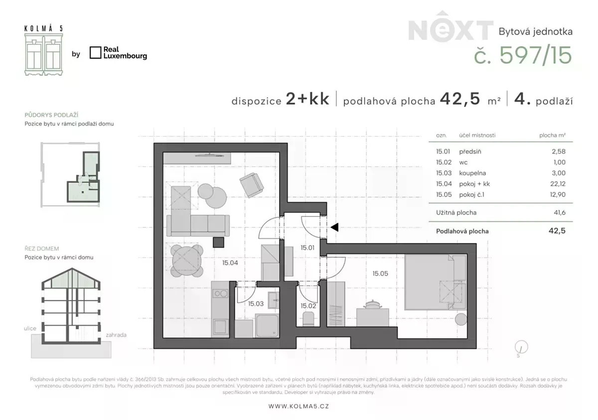 Náš projekt KOLMÁ 5 v pražských Vysočanech má vše, co si od startovacího, nebo investičního bydlení můžete přát. Perfektní lokalita: všechnu důležitou infrastrukturu máte v docházkové vzdálenosti, stejně tak parky a přírodu. MHD: tramvajová a autobusová zastávka (Podkovářská) - 3 minuty a v úplném centru jste do půl hodinky, metro (Kolbenova) - 15 minut, vlak (nádraží Libeň) - 13 minut Nákupní možnosti: Billa přímo naproti projektu přes ulici Poděbradská, v blízkosti ještě Albert Zábava a sportovní vyžití: O2 aréna - 20 minut, Rugby club Praha, fitness louka Rokytka - 10 minut, Factory Form fitness Harfa - 25 minut Příroda a místo pro odpočinek: Park Zahrádky 15 minut, Park Smetanka a meandry Rokytky 20 minut Gastronomie: v bezprostředním okolí je nespočet restaurací, bister, fast foodů či kaváren, takže v tomto ohledu Vám zde také nebude nic chybět Činžovní dům aktuálně prochází rozsáhlou rekonstrukcí, po které nabídne 20 jednotek ve vysokém standardu. Rekonstrukce zahrnuje centrální rozvody médií, fasádu, společné prostory. V jednotkách pak nové rozvody, podlahy, koupelny, sanita a mnoho dalšího. Zbývá už jen vybavení a můžete kvalitně a pohodlně bydlet, nebo bezproblémově pronajímat. Tato konkrétní jednotka č. 15 o dispozici 2kk a podlahové ploše 43 m2 se nachází ve 4 nadzemním podlaží s výhledem jak do ulice, tak do zahrady. Je členěna na vstupní chodbu, samostatnou toaletu, obývací pokoj s kuchyňským koutem, ze kterého je přístup do koupelny a oddělenou ložnici. Přesné rozložení si můžete prohlédnout na přiloženém půdorysu. Vytápění je řešeno elektrickými přímotopy a ohřev vody elektrickým bojlerem. Prohlídky budou možné během září. Dokončení rekonstrukce je naplánováno na říjen s předáním do konce roku. Pokud Vás již nyní něco zajímá, nebo máte určité dotazy, tak se mi ozvěte. Rád se Vám budu věnovat. Nabízíme Vám kompletní servis včetně právních služeb, zajištění potřebných dokumentů, pomoc s financováním, pojištěním nemovitosti, pojištěním nájmu a domácnosti, vybavením bytu, bytovým designem či přepisem energií. U nás máte možnost využít moderní družstevní financování až na 30 let, bez ohledu na věk či prokazování příjmů - ideální i pro podnikatele bez nutnosti předkládat daňové přiznání. Zjistěte, jak můžete bydlet chytře! Pro komunikaci uvádějte evidenční číslo zakázky N113941.