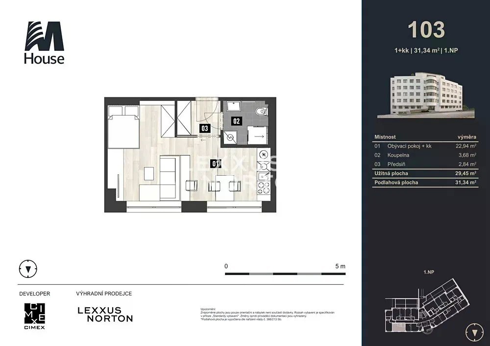 Představujeme exkluzivní ubytovací jednotku 1+kk k prodeji (31,34 m²) v nově vznikajícím rezidenčním projektu M-House, který je synonymem pro komfort, funkčnost a moderní životní styl nedaleko Kubánského náměstí v pražských Vršovicích. Jednotka je navržena s důrazem na praktické a plnohodnotné využití prostoru a nachází se na prvním nadzemním podlaží. Ze vstupní chodby plynule přejdete do hlavní obytné části (22,9 m²), která propojuje kuchyňský kout, obývací prostor a ložnicovou zónu. K dispozici je také moderní koupelna se sprchovým koutem a toaletou. Kvalitní vybavení a moderní technologie jsou samozřejmostí, což zaručuje maximální pohodlí a funkčnost. K jednotce je možné dokoupit parkovací stání a sklepní kóji. M-house se nachází na pomezí Vršovic a Vinohrad, jen kousek od Kubánského náměstí. Tato strategická poloha nabízí dokonalou rovnováhu mezi klidným bydlením a bohatou městskou vybaveností. Díky blízkosti hlavních dopravních tepen a zastávek MHD se snadno dostanete do centra Prahy i do jejích dalších částí. V okolí se nachází pestrá nabídka obchodů, supermarketů, mateřských i základních škol a zdravotnických zařízení. Gastronomičtí nadšenci zde najdou celou řadu kaváren, restaurací a bister. Milovníci přírody si zamilují park Ruth Bondyové, ideální pro relaxaci, procházky či pikniky, i nově vznikající park Drážní promenáda, inspirovaný světoznámou newyorskou High Line. Nedaleká sportovní a rekreační zařízení nabízejí široké spektrum aktivit pro všechny věkové skupiny - bazén, venkovní sportoviště, zimní stadion a Fortuna Arenu.