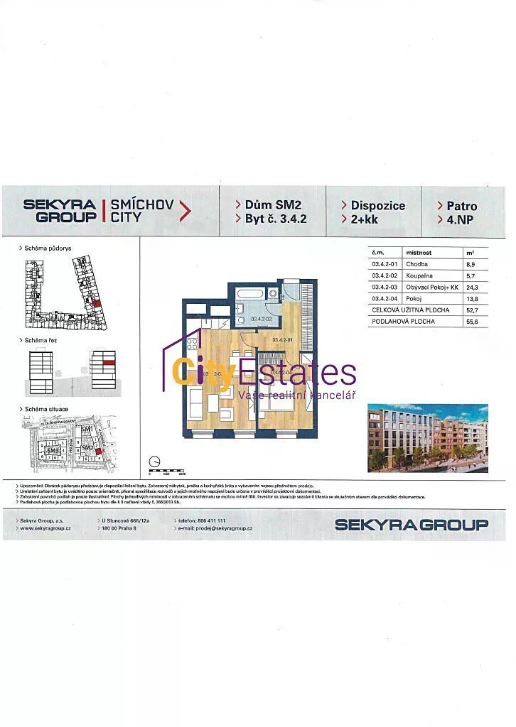 Nabízíme Vám k dlouhodobému pronájmu moderní byt 2+kk s garážovým stáním v unikátním bytovém komplexu Smíchov City. Předmětný byt se nachází v sekci SM2-3 a disponuje vlastní uzavřenou zahradou s výhradním přístupem pouze pro obyvatele domu SM2. V areálu je recepce. Budova má 6 nadzemních a 3 podzemní podlaží. Byt je v ulici Nádražní, u tramvajové zastávky „Na Knížecí“ naproti ulice Na Valentince. Luxusně vybavený byt s celkovou plochou 55,7m2 se nachází ve 4NP. Umístění v rámci komplexu a uspořádání bytu naleznete v obrazové dokumentaci. Obývací pokoj je vybaven novou kuchyňskou linkou IKEA s kvalitními spotřebiči jako je lednice s mrazákem, varná deska, trouba, digestoř, mikrovlnná trouba a myčka na nádobí. Dále je zde sedací souprava, konferenční stolek, TV stolek a jídelní stůl se židlemi. Obývací pokoj a ložnice mají dřevěnou podlahu a okna obou místností jsou opatřena elektricky ovládanými venkovními žaluziemi. Předsíň, koupelna a chodba je osazena velkoformátovou šedou dlažbou. V předsíni se nachází praktická stěna poskytující množství úložného prostoru. V ložnici je další šatní skříň se zrcadlem a manželská postel s oddělenými matracemi. Ve velmi vhodně řešené koupelně se sprchovým koutem, zařízené sanitou Villeroy&Boch a Grohe, je připraven prostor pro pračku a sušičku. Toaleta je součástí koupelny. Komfort bydlení zajišťuje i rekuperační jednotka. V ceně nájmu je garážové stání v 1PP domu a sklep o výměře 1,8m2. Velkou výhodou rezidenčního domu SM2 je absolutní dostupnost. Metro, tramvaje či vlaky jsou v přímém sousedství. Letiště Václava Havla je vzdálené jen necelou půlhodinu. A skvělá je i dostupnost autem a přímé napojení na městský okruh. V nejbližším okolí najdete kompletní občanskou vybavenost, restaurace, kavárny, lékárny, OC - Nový Smíchov a mnoho dalších obchodů a možností. Všechny tyto služby jsou v docházkové vzdálenosti. Nájem ve výši 27.900,- Kč + vratná kauce 30 000,- Kč + poplatky spojené s užíváním bytu 5 500,- Kč. Elektřina se převádí na nájemce (předpokládané zálohy 1 000,- Kč). Internet si nájemce zřizuje sám. K dispozici od 30.11.2025, ale po dohodě se současným nájemcem je možné i dříve. Ideální bydlení pro jednotlivce nebo pár. Vřele doporučuji. Nájemce je seznámen s provizí realitní kanceláře ve výši jednoho měsíčního nájmu + DPH. Ráda si s Vámi dohodnu termín prohlídky, neváhejte mě kontaktovat.