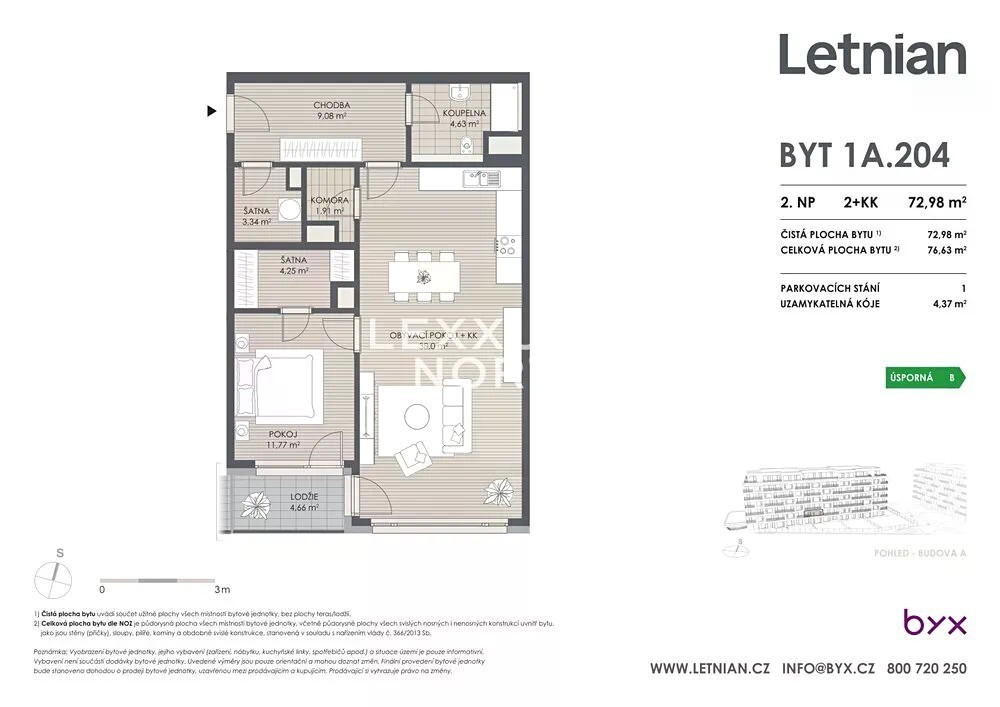 Nabízíme světlý byt 2+kk o celkové ploše 76,63 m², který se nachází v přízemí rezidenčního projektu Letnian. Byt disponuje prostorným lodžii o výměře 4,66 m², který nabízí příjemný výhled a dostatek soukromí. Dispozici tvoří obývací pokoj s kuchyňským koutem, ložnice s dostatkem místa pro šatní skříň, koupelna s toaletou, komora a prostorná vstupní chodba. Byt je dokončen ve vysokém standardu, zahrnuje kvalitní laminátové podlahy, kvalitní obklady a sanitu koupelen, přípravu na venkovní elektrické žaluzie a kompletní přípravu pro kuchyňskou linku. K bytu lze dokoupit parkovací stání v podzemní garáži a sklep. Součástí projektu je společná zahrada s relaxační zónou a dětským hřištěm. Projekt Letnian se nachází v Letňanech, které nabízejí kompletní občanskou vybavenost - školy, školky, restaurace, kavárny, aquapark a další sportovní zařízení. Obchodní centrum Letňany je vzdáleno pouhé 2 min chůze. Dopravní spojení je vynikající, autobusová zastávka je vzdálena 200 m od rezidence a metro Letňany je jen pár minut od projektu. Snadný přístup na Pražský okruh umožňuje také rychlé spojení autem.
