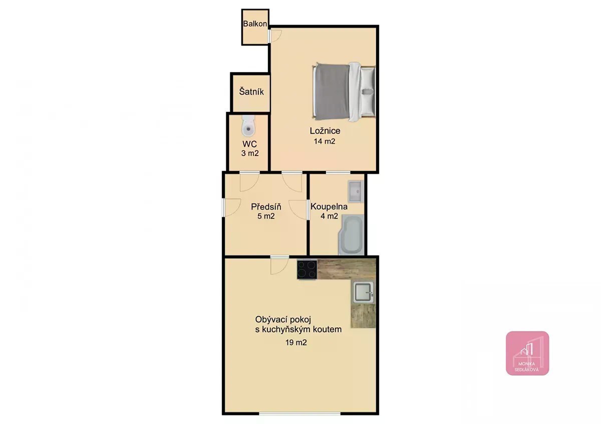 Proč si pronajmout právě tento byt v Králově Poli? Výborná dispozice 2+kk s umístěním ve druhém patře v nejoblíbenější městské části Brna. Prostorná obývací část bytu s moderní kuchyňskou linkou a se spotřebiči. Ložnice se šatnou a balkonem do vnitrobloku. Koupelna s vanou, umyvadlem, pračkou a sušičkou + samostatná toaleta. Neprůchozí pokoje a spousta úložného prostoru. Plně vybavený nábytkem a spotřebiči: středně velká lednička, pračka, sušička, myčka, indukční deska, elektrická trouba, mikrovlnka, rozkládací sedačka, jídelní stůl a židle. V ložnici dvojlůžko, komody, noční stolek, zrcadlo, vestavěná skříň, šatní skříň s úložnými prostory. Vše je zde nové, světlé, moderní a plně funkční. Stačí se jen nastěhovat! A navíc skvělá poloha a oblíbenost městské části Královo Pole v sousedství výtečné zmrzlinárny Barčelato. Do centra města MHD 15 minut. Pro milovníky přesných čísel: Celková plocha bytu 45 m2. Předsíň 5 m2, obývací pokoj s kuchyňským koutem 19 m2, ložnice se šatnou14 m2, koupelna 4 m2, toaleta 3 m2. Měsíční vyúčtovatelné zálohy celkem 4 650 Kč. Voda 600 Kč, vytápění 2 000 Kč, elektřina 1 400 Kč, spol. elektřina v domě 50 Kč, úklid 200 Kč, T-mobile internet 400 Kč. Napište mi něco o vás a přijďte se přesvědčit osobně, zda je tato nemovitost vhodná právě pro Vás. Byt bude volný od 1.12.2025. Ráda Vás provedu.