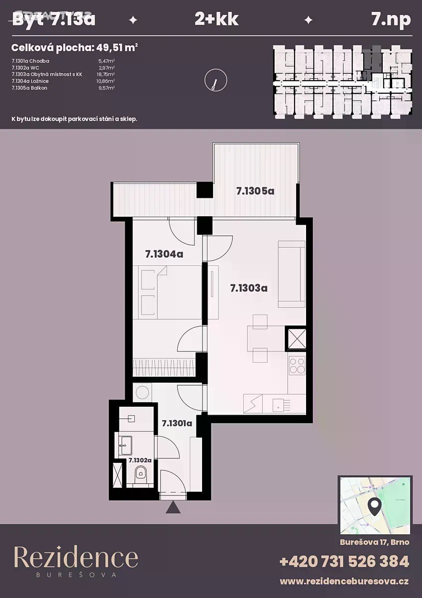 Nabízíme k prodeji moderní byt 2+kk o podlahové ploše 39,94 m2 s balkonem 9,57 m2 nacházející se v námi připravovaném projektu Rezidence Burešova v atraktivní lokalitě Veveří. Byt se nachází v 7.NP, orientace bytu do vnitrobloku, jižní strana. K bytu lze koupit parkovací místo v zakladači i sklad. Orientace tohoto bytu je jih. Velkorysý balkon umožňuje po dlouhém pracovním dni nejen relaxaci, ale i příjemné posezení s rodinou. Podlahové vytápění zajišťuje rovnoměrné a příjemné teplo po celém bytě. Celý byt je navržen s důrazem na moderní design a kvalitní materiály, což splňuje vysoké standardy. Byt disponuje přípravou na předokenní žaluzie, přípravou na centrální klimatizaci a rekuperací. V domě se nachází prostorná místnost určená pro kočárky a kola. Rezidence Burešova se nachází v oblíbené a vyhledávané lokalitě v blízkosti parku Lužánky umožňující relaxaci v zeleni i sportovní vyžití. Umístění domu nabízí veškerou občanskou vybavenost, včetně obchodů, restaurací a kaváren, divadel a kin v docházkové vzdálenosti. Dále se vyznačuje výbornou dopravní dostupností do centra města. Dokončení projektu je plánováno ke konci roku 2027. Pokud hledáte komfortní a moderní bydlení v blízkosti centra města Brna, je tento byt tou pravou volbou pro vás. Pro více informací nebo sjednání prohlídky s možností výhledu ze stávající budovy nás neváhejte kontaktovat.