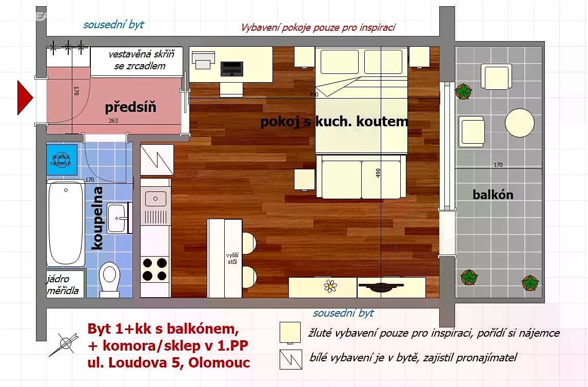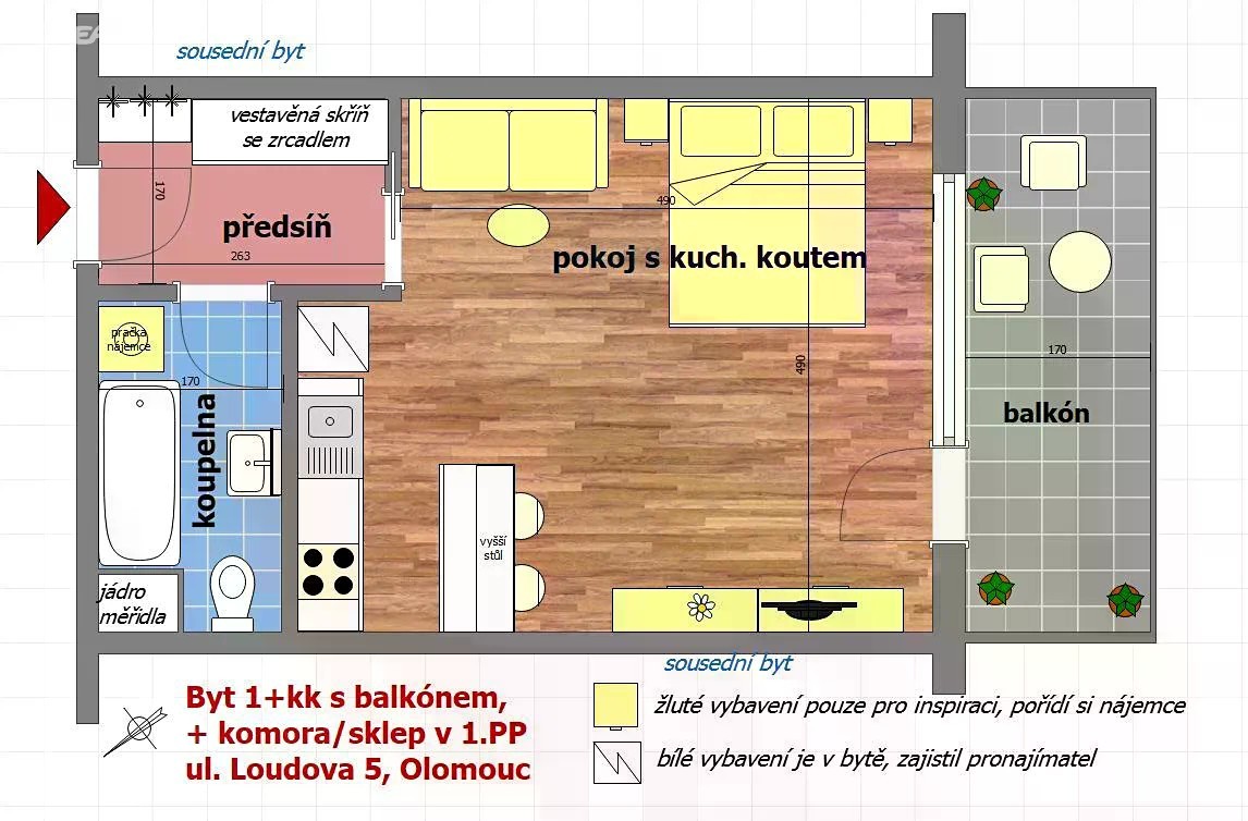 Byt 1+kk je ve 4. podlaží - (předposlední) v bytovém domě z r. 2018, v Olomouci, na ul. Loudova. Užitná plocha je byt 38,2 m2 + balkón 8,9 m2 + komora/sklep 2,2 m2, celkem 49 m2 + garážové stání č. 12. Byt je částečně zařízený, bude volný od 16.12.2025. Jedná se o prostorný světlý byt, balkón na JZ do klidné ulice, koupelna s vanou a WC. Zděná komora/sklep je v 1.PP, garážové stání v ceně uvedeného nájmu. Pokud nemáte auto, můžete podnajímat garážové stání jiné osobě, poradíme jak na to. Dispozici uvidíte na půdorysu. V předsíni velká vestavěná skříň se zrcadlem, věšáková stěna s botníkem, osvětlení všech místností, v pokoji garnyže. V pokoji o velikosti 26,3 m2 je bílá kuchyňská linka se spotřebiči s barovým pultem se 2 vyššími židlemi, dostatek úložného prostoru. Lednici můžete mít svoji nebo vyzkoušet menší ledničku pronajímatele, uloženou v komoře. Ostatní vybavení v bytě si můžete nastěhovat/zařídit podle sebe, postele a pohovka patří současné nájemnici. V bytě je teplovodní podlahové vytápění s programovatelným termostatem. Na balkóně je dlažba, osvětlení a el. zásuvka, díky bočním stěnám i příjemné soukromí. Současná nájemnice nabízí nábytek na balkoně k odkupu a 2 bílé barové židle - viz foto. U vstupu do domu je videotelefon. Vjezd do garáží po rovině, výjezd bezpečný do ul. Loudova. K nájmu 13200 Kč/měs se budou platit zálohy 3800 Kč včetně elektřiny, internet si zajistíte sami - je tam optika. Vratná jistota bude 20000 Kč, rezervační poplatek, tj. bud. provize od nájemce, bude 12000 Kč, další část hradí pronajímatel. Nyní v bytě bydlí 1 slečna, bez zvířat. Jedná se o dům dokončený v r. 2018, postavený za budovou koupelnového studia, balkón orientovaný do klidné ulice, vše je čisté, v dobrém stavu. Pěkné okolí - rybník Hamrys, restaurace 5 min., zastávka MHD 2 min., cyklostezky, blízko do nemocnice, na Horní lán, rychlé napojení na dálniční síť. Na zastávku nové tramvaje je to 8 min., poblíž fitness, masáže, další služby. Koho hledáme? Ideálně 1 dospělou zodpovědnou osobu, co hledá takové bydlení na min. 2 roky. Nekuřácký byt. Zvíře musíme před prohlídkou projednat s pronajímateli. Zavolejte, dotazy zodpovím, prohlídky domluvené na čt 6.11. v 16 hod.
