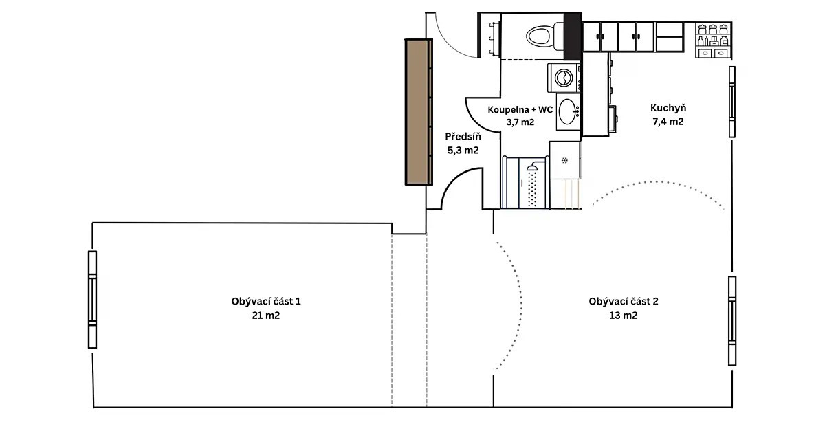 Nabízíme k pronájmu světlý cihlový byt po rekonstrukci o dispozici 2+kk a podlahové ploše 51 m². Nachází se ve 2. podlaží udržovaného domu, Plzeň-Slovany. Byt má prakticky řešenou dispozici. Vstupní chodba je vybavena na míru vyrobenou vestavěnou skříní. Z chodby se vstupuje do koupelny se sprchovým koutem, toaletou, umyvadlem, zrcadlem s osvětlením a novou pračkou. Na hlavní obytný prostor plynule navazuje další místnost s kuchyňským koutem. Kuchyně je po kompletní rekonstrukci: nová linka, elektrická trouba, sklokeramická deska, vestavná myčka a volně stojící designová lednice. K bytu náleží sklep. Vytápění je centrální dálkové, ohřev vody zajišťuje nová karma. Dům má plastová okna a vstup na čip. Lokalita nabízí kompletní občanskou vybavenost: přibližně 7 minut chůze ke Galerii Dvořák, v blízkosti je dále plavecký bazén, tenisové kurty i sportovní hala. Bezproblémové parkování je k dispozici přímo před domem. Byt je k nastěhování ihned. Nájemce hradí k nájemnému zálohy na energie a služby cca 1 800 Kč/měs. (topení, voda, odpad, společné prostory apod.). Elektřina a plyn budou převedeny na nájemce. Vratná kauce ve výši dvojnásobku nájemného. Preferujeme dlouhodobý pronájem; domácí mazlíčci po dohodě. RK prosím nevolat.