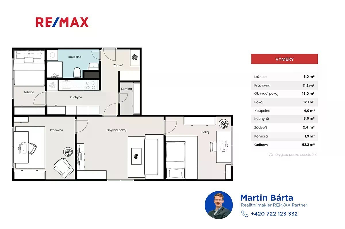 Nabízíme vám byt o dispozici 4+kk a užitné ploše 66 m², po kompletní rekonstrukci. Byt je připravený k okamžitému nastěhování a nabízí moderní, komfortní bydlení. V rámci rekonstrukce byly provedeny: • kompletní elektroinstalace v mědi a nový rozvaděč. • zděné jádro, • podlahy z PVC, • koupelna s dlažbou, • vybavená kuchyň připravená k okamžitému užívání. Dům: • kompletně revitalizovaný, • zateplený včetně střechy, • plastová okna s izolačními dvojskly, • nový výtah. Měsíční náklady na bydlení činí 4 145 Kč + elektřina. Lokalita - Pekárenská ulice: Vyhledávaná rezidenční část města, pouhý 1 km od centra Českých Budějovic. Veškerá občanská vybavenost je v pohodlném dosahu: • obchodní centrum IGY - 350 m, • autobusová zastávka Jírovcova - přímo před domem, • MŠ, ZŠ a SŠ polytechnická - cca 350 m, • centrum města - 1 km. Byt je volný k nastěhování ihned. Pokud vás tato nabídka zaujala, neváhejte mě kontaktovat. Rád vám poskytnu další informace a domluvím termín prohlídky.