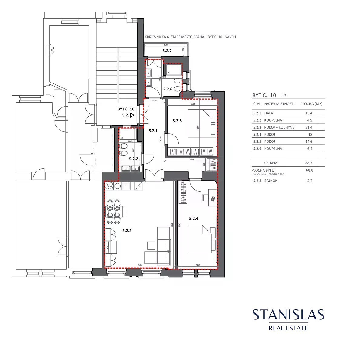 STANISLAS Real Estate představuje byt naproti hotelu Four Seasons v Praze, přímo u břehu Vltavy. Z obývacího pokoje je výhled na polovinu Pražského hradu. Tento byt o velikosti 95,5 m² a s balkonem o ploše 2,7 m², který lze upravit dle Vašich představ, nabízí minimálně tři pokoje, včetně reprezentativního obývacího pokoje s jídelnou o rozloze více než 31 m² a dvou ložnic. Přímý výhled na Pražský hrad vytváří jedinečnou a prestižní atmosféru ve dne i v noci. Společné prostory budovy budou kompletně nově zrekonstruovány a parkování je možné pro všechny Vaše vozy jen pár metrů od náměstí Rudolfinum. Díky centrální poloze bytu máte snadný přístup ke všem vyhlášeným restauracím a rychlé dopravní spojení kamkoli po městě. Více fotografií najdete na našem webu. - STANISLAS Real Estate -