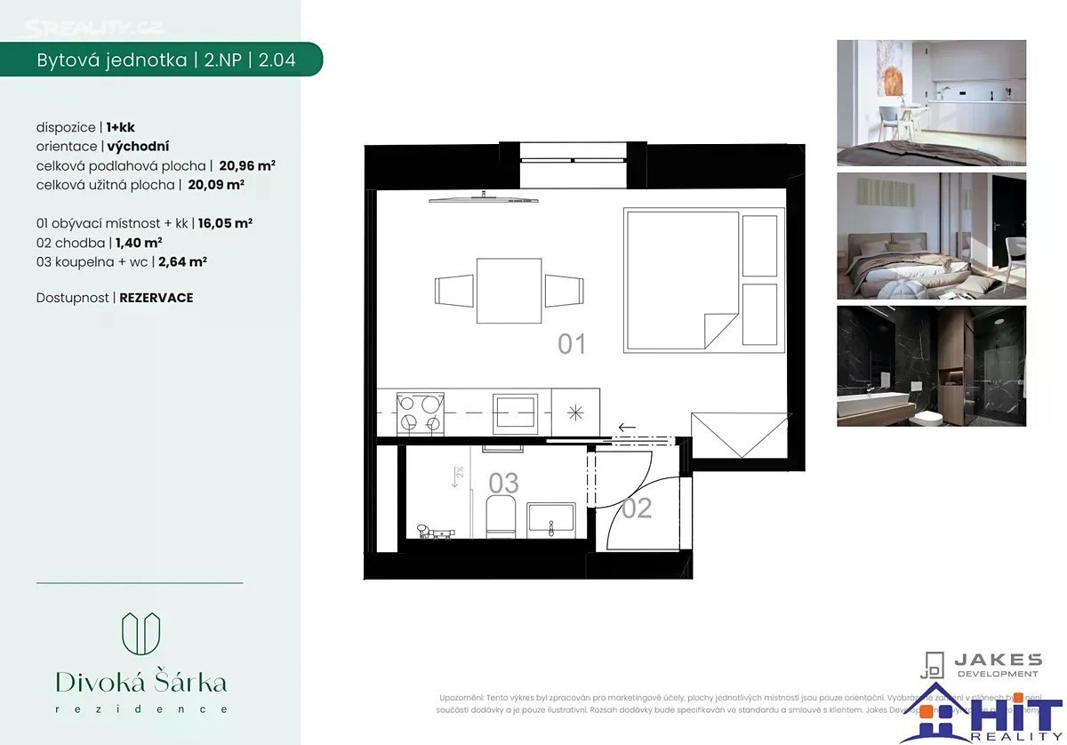 Nabízíme k prodeji moderní byt 1+kk o podlahové ploše 21 m2, který se nachází v nově zrekonstruované Rezidenci Divoká Šárka v ulici Jenečská, Praha 6, Liboc. Byt je situován v klidné rezidenční části a představuje ideální kombinaci pohodlí, dostupnosti a kontaktu s přírodou. Byt se nachází v 3. nadzemním podlaží a díky své orientaci působí světlým a vzdušným dojmem. Dispozici tvoří obývací pokoj s kuchyňským koutem, koupelna se sprchovým koutem a WC a vstupní chodba. Interiér je řešen s důrazem na funkčnost a čistý design, který osloví jak zájemce o vlastní bydlení, tak investory. Byt je vybaven moderní kuchyňskou linkou s vestavnými spotřebiči. Najdete zde lednici s mrazákem, troubu, varnou desku, myčku a a dřez s baterií. Samozřejmostí je kompletní osvětlení, garnýže ve všech oknech a kvalitní vinylové podlahy. Koupelna je obložena keramikou v neutrálním elegantním tónu. Vytápění je ústřední plynové s radiátory ve všech obytných částech, což zajišťuje komfortní teplotu po celý rok a nízké provozní náklady. Součástí rezidence je společné venkovní posezení a uzamykatelný box na kola s kapacitou až 10 kol. Rezidence Divoká Šárka se nachází v jedné z nejžádanějších pražských lokalit, v pěší vzdálenosti od přírodního parku Divoká Šárka, Libockého zámečku, obory Hvězda i OC Šestka. Je zde výborná dopravní dostupnost. Zastávky MHD jsou jen pár minut chůze, metro A - Nádraží Veleslavín i letiště Václava Havla jsou dosažitelné během několika minut. Tento byt představuje skvělou investiční příležitost i vhodné bydlení pro jednotlivce, kteří hledají kvalitní a praktický byt v prestižní části Prahy 6, v dosahu přírody i městských služeb.