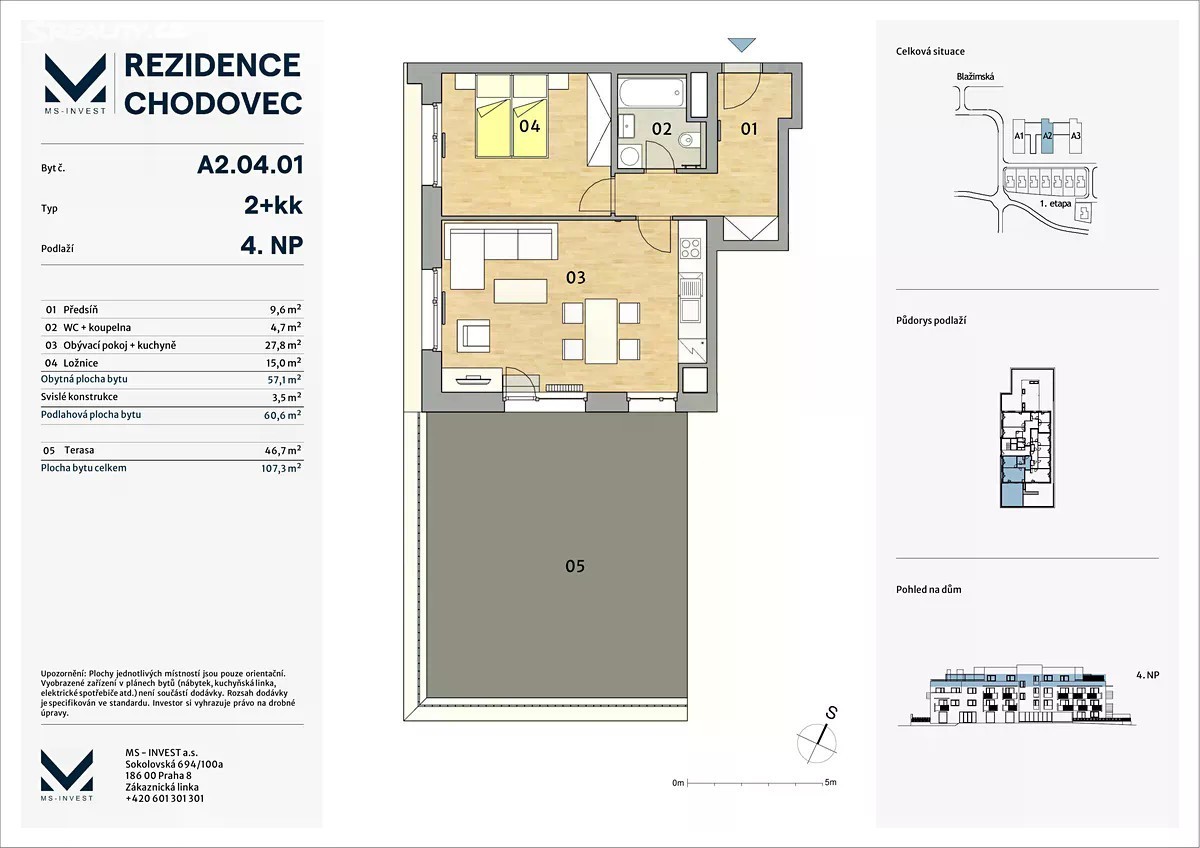Nabízím k prodeji světlý a velkoryse řešený byt 2+kk o velikosti 60,6 m² v nejvyšším patře moderního projektu Rezidence Chodovec s prostornou terasou 46,7 m², na které může budoucí majitel přidat zimní zahradu a bude tak mít další obytný prostor navíc. Výstavba celého projektu bude dokončen 12/2025. Termín předání bytu je naplánován na 02/2026. Dispozice: - obývací pokoj s kuchyňským koutem (27,8 m²) - ložnice (15 m²) - koupelna s vanou a WC (4,7 m²) - předsíň (9,6 m²) - terasa (46,7 m²) K bytu náleží sklep (2,6 m²), který je již zahrnut v ceně. Budoucí majitel má možnost dokoupit 1 garážové stání v podzemní garáži za 750 000 Kč. Všechna okna a terasové dveře jsou vybavena venkovními žaluziemi, které zajišťují soukromí i komfort v letních měsících. V bytě jsou také připraveny rozvody na klimatizaci, stačí pouze dokoupit a nainstalovat vlastní klimatizační jednotky. Jedná se o přenechání kupní smlouvy s developerskou společností. Proto neplatíte žádnou provizi. Lokalita a okolí Rezidence Chodovec se nachází v klidné části Prahy 4 s rychlým napojením na městský okruh a dálnici D1. Lokalita spojuje moderní městské bydlení s blízkostí přírody - v okolí najdete přírodní park Hostivař-Záběhlice a relaxační zóny Trojmezí. V docházkové vzdálenosti jsou: - Sportovní centrum Jedenáctka s bazénem a wellness - oblíbené místo pro sport a relax, - Westfield Chodov s kompletní obchodní a zábavní nabídkou, školy, školky, restaurace, kavárny a veřejná doprava. - Autobusová zastávka je v blízkosti rezidence a na stanici metra C - Chodov se dostanete během několika minut. Výhody oproti konkurenci - Velká terasa 46,7 m² - mnohonásobně větší než u běžných 2+kk v Praze - Nejvyšší patro - žádní sousedé nad vámi, více světla a soukromí - Venkovní žaluzie - již v ceně - Předpříprava na klimatizaci - bez nutnosti dalších stavebních úprav - Sklep 2,6 m² - již také v ceně - Možnost dokoupit 1 garážové stání v podzemí - za 750 000 Kč - Bez provize - přímý prodej od majitele Pro více informace se neváhejte mne kontaktovat. V případě, že se mi nedovoláte, stačí zanechat zprávu a spojím se s Vámi hned, jakmile budu moci. Pozn.: Veškeré vložené vizualizace jsou pouze ilustrační dle skutečného půdorysu.