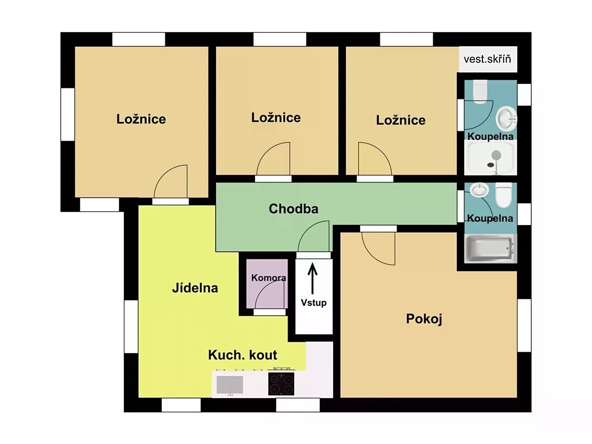Máme pro Vás k pronájmu cihlový byt 5+kk o velikosti 150 m2 nacházející se v 1.patře rodinného domu u města Přelouče. Dům i byt prošel nákladnou rekonstrukcí. Součástí bytu je chodba, velká místnost sloužící jako kuchyň s jídelnou, 4 samostatné pokoje, v každém vestavné skříně, v 1 pokoji vlastní koupelna se sprchovým koutem a wc, komora a koupelna s vanou a toaletou, topení ústřední plynovým kotlem. Požadována kauce. Možnost parkování před domem v uzavřeném dvoře, lze využívat i přilehlou společnou zahradu. Byt je zařízen nábytkem, k nastěhování po zaplacení. Více informací u makléře.