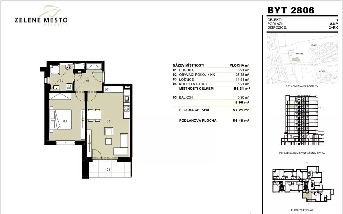 Prodej bytu 2+kk, 57 m² - Zelené Město Heights, Praha 9 Nabízíme k prodeji krásný a světlý byt 2+kk o celkové ploše 57,21 m² (včetně balkonu 5,9 m²), který se nachází v 8. nadzemním podlaží moderního rezidenčního projektu Zelené Město Heights. Byt se skládá z prostorného obývacího pokoje s kuchyňským koutem (25,38 m²), ložnice (14,81 m²), koupelny s toaletou (5,21 m²) a vstupní chodby (5,91 m²). K bytu náleží také balkon o výměře 5,9 m², který nabízí příjemné posezení s výhledem do okolí. Díky umístění v 8. patře je byt velmi světlý a vzdušný, s orientací zajišťující dostatek denního světla po celý den. Projekt Zelené Město Heights se vyznačuje vysokým standardem zpracování, moderní architekturou a důrazem na propojení městského bydlení s přírodou. V blízkosti se nachází Malešický park, cyklostezky, dětská hřiště, školy, školky a veškerá občanská vybavenost. Výborné dopravní spojení Pro blizsi informace volejte makléře. Služby včetně fondu oprav 4000 Kc Crna bytu 8 656 123 Cena sklepu 160 000 Oarkovací stání 500 000