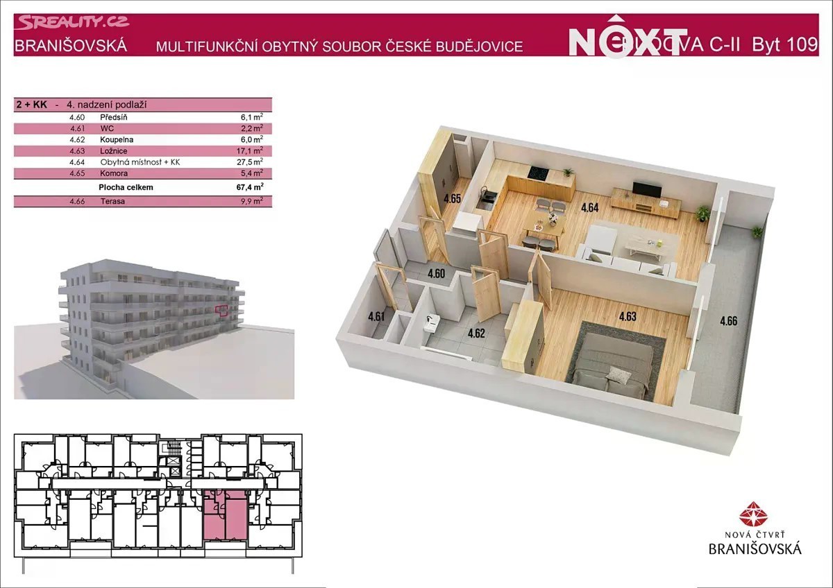 Představujeme vám elegantní byt č. 109 2+kk o užitné ploše 67,4 m² s prostornou terasou 9,9 m², umístěný ve čtvrtém nadzemním podlaží (tedy ve třetím patře) nového rezidenčního projektu na Branišovské ulici v Českých Budějovicích. Byt je orientován na západ do klidného vnitrobloku, což mu dodává dostatek světla a současně zaručuje naprosté soukromí. Už při vstupu do bytu vás přivítá předsíň o velikosti 6,1 m², která nabízí prostor pro vestavěné skříně i praktický botník. Na ni navazuje samostatné WC o velikosti 2,2 m² a moderní koupelna o velikosti 6,0 m², která je navržena v čistém, nadčasovém stylu a poskytuje dostatek prostoru pro komfortní každodenní užívání. Hlavní obytný prostor s přípravou na kuchyňskou linku o ploše 27,5 m² tvoří srdce bytu - otevřený, vzdušný a plný denního světla díky velkým francouzským oknům vedoucím na terasu. Ložnice o velikosti 17,1 m² působí elegantně a klidně, s dostatečným prostorem pro velkou postel i šatní skříň. Z obytné místnosti i z ložnice je přímý vstup na terasu, která o ploše 9,9 m² rozšiřuje obytný prostor o příjemné venkovní posezení s výhledem do zeleně vnitrobloku. Součástí bytu je i praktická komora o velikosti 5,4 m², ideální pro uložení sezónních věcí, sportovního vybavení nebo domácích potřeb - prostor, který u novostaveb často chybí, zde však nechybí vůbec nic. Byt nemá k dispozici sklep, ani parkovací stání v garáži. Parkovat je možno volně před bytovým domem. Byt se nachází v energeticky úsporné budově s energetickým štítkem A, což znamená velmi nízké provozní náklady a moderní technologie zajišťující komfort i úsporu. Projekt Branišovská je synonymem pro kvalitní a promyšlené bydlení - spojuje klid, zeleň a výbornou dostupnost do centra města. V okolí se nachází školy, školky, obchody, nákupní centrum Čtyři Dvory i zastávky MHD. Milovníci aktivního života ocení blízké cyklostezky, parky i sportoviště. A jen pár minut odtud vás čeká historické centrum Českých Budějovic s kavárnami, restauracemi a kulturním děním. Tento byt je ideální jak pro vlastní bydlení, tak jako bezpečná investice s výborným potenciálem pro dlouhodobý pronájem. Těšíme se na prohlídky s Vámi. Pro komunikaci uvádějte evidenční číslo zakázky N114383.