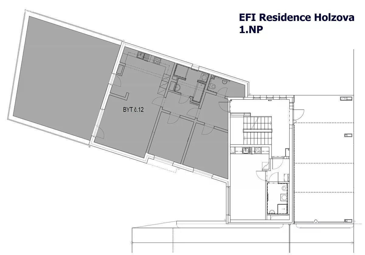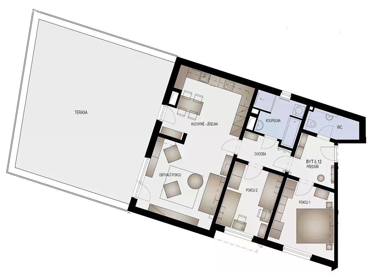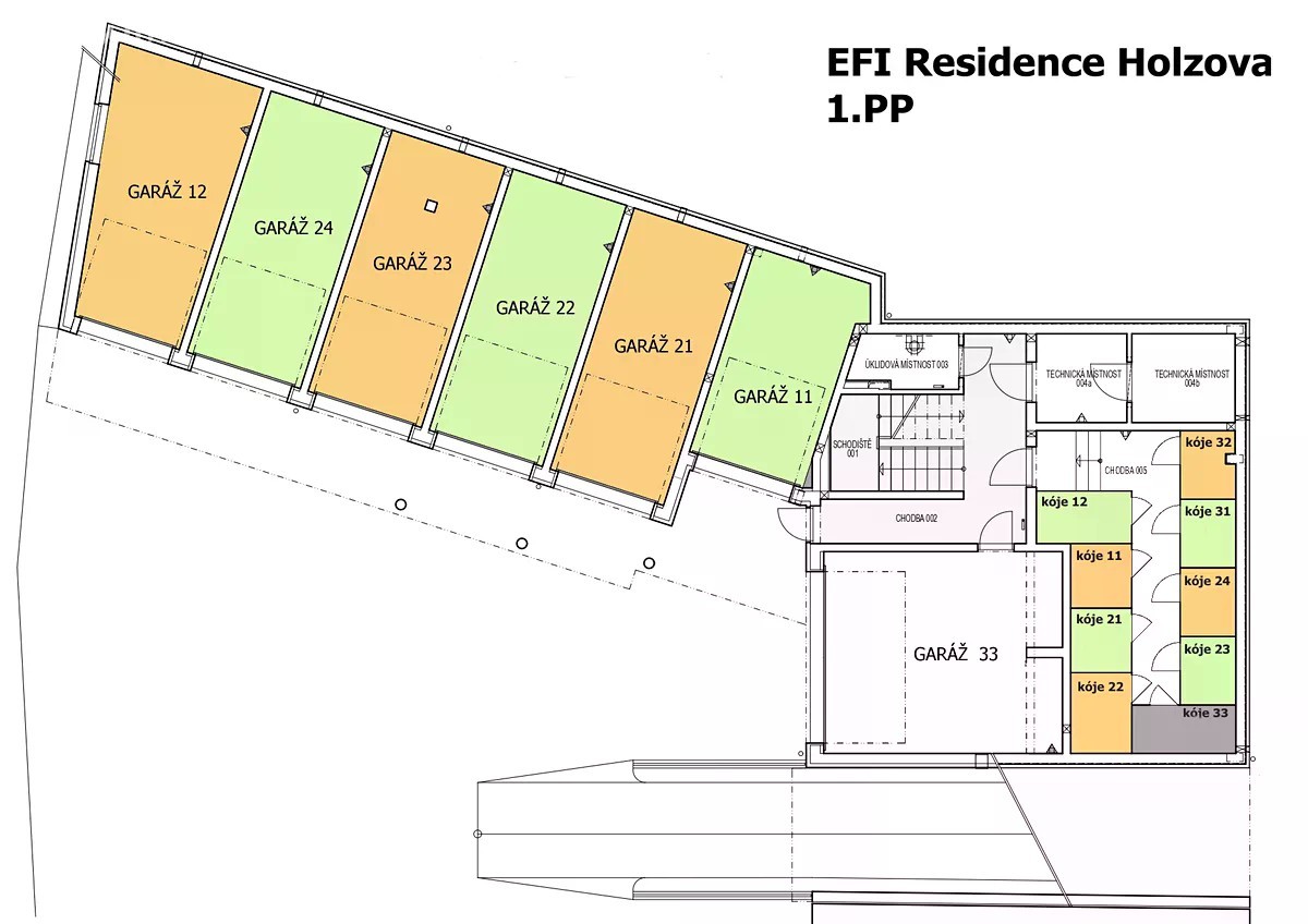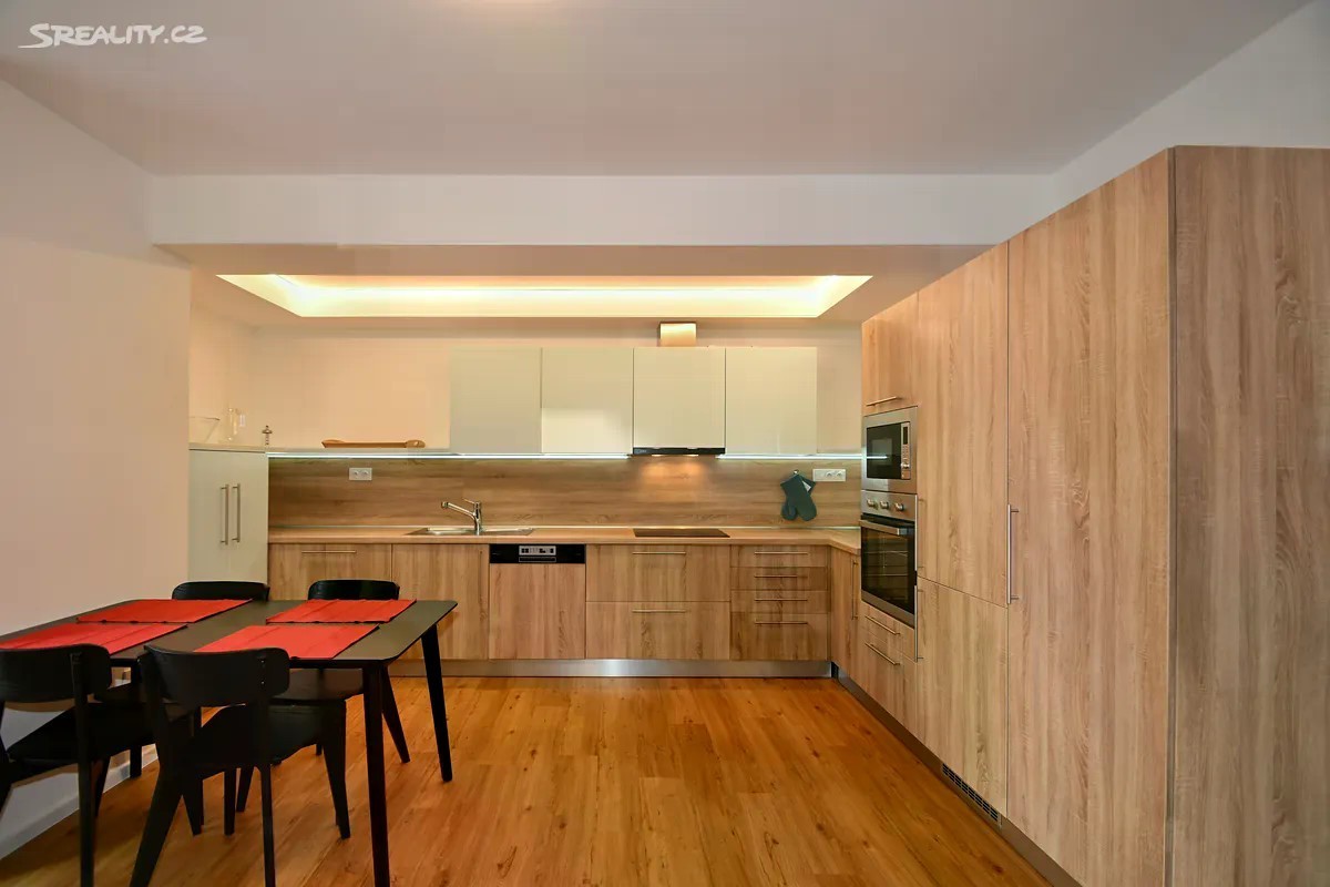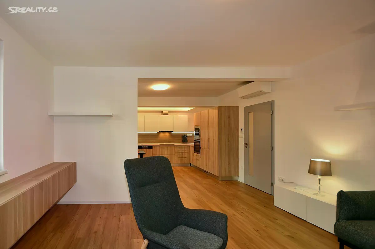 Třípokojový byt s kuchyňským koutem o celkové podlahové ploše 83,8 m2 + terasa 66 m2 + sklepní kóje 3 m2. Bytový dům byl zkolaudován v září 2022. Byt je umístěn v přízemí bytového domu. Obývací pokoj s kuchyňským koutem (38,1 m2) obsahuje toto zařízení: Velkou kuchyňskou linku včetně spotřebičů, sporák s indukční varnou deskou a s horkovzdušnou elektrickou troubou, digestoř, mikrovlnná trouba, myčka nádobí, dřez. Z obývacího pokoje je přímý vstup na terasu (66 m2), která je orientována na západní stranu. Další dva pokoje (13,3 m2 a 11,2 m2) mají samostatné vstupy a okna orientovaná do dvorní částí bytového domu. Předsíň (6,2 m2) je vybavena dveřním videotelefonem, WC (4,1 m2), chodba (4,7 m2), V koupelně s umyvadlem, vanou a sprchový koutem (6,3 m2) je přípojka na pračku. V bytě je podlahové topení s plynovým kondenzačním kotlem Baxi Nuvola Duo-tec, se zásobníkem pro ohřev teplé vody. Vlastní klimatizační jednotka zn. Daikin. Byt je vybaven systémem pro řízení chytré domácnosti zn. SIEMENS. Instalovaný Smart systém umožňuje uživatelům bytu pohodlně ovládat z jednoho místa topení, chlazení a stínění oken. Dřevěná okna s izolačními trojskly a s předokenními žaluziemi zn. VEKRA, ovládanými elektrickým pohonem. V celém bytě jsou vinylové podlahy. V suterénu bytového domu je sklepní kóje 3 m2. K bytu je nutné dokoupit i garáž s dálkově ovládanými sekčními vraty s vjezdem z dvorní části bytového domu. K výběru jsou garáže s výměrou od 19,5 m2, cenově od 1.367.000 Kč. Městská část Líšeň leží východně od centra Brna s dobrou dopravní dostupností na dálnici D1 i do centra Brna. V blízkosti se nachází zastávky autobusu MHD a v okolí je i veškerá občanská vybavenost. Pro výlety do přírody je ideální blízkost Mariánského údolí i lesy severovýchodně od Brna navazující na CHKO Moravský kras.