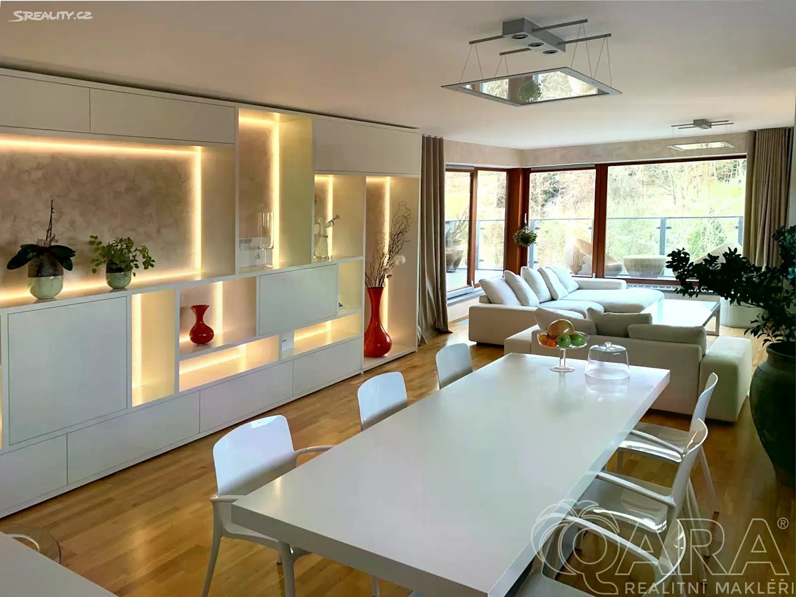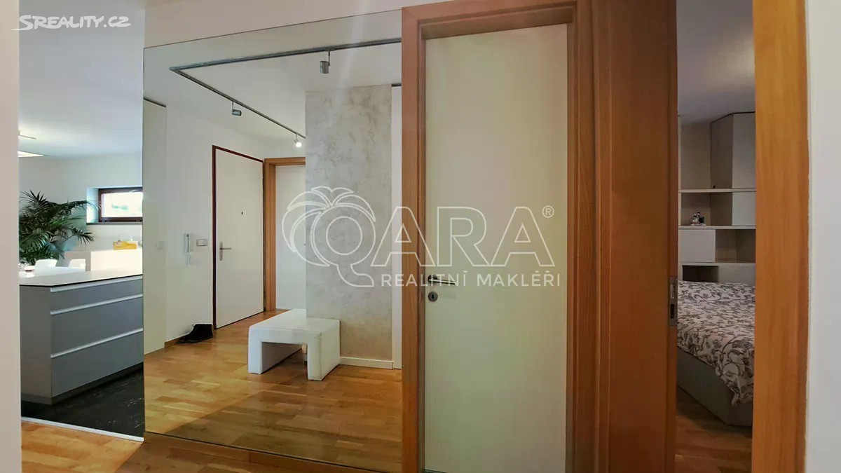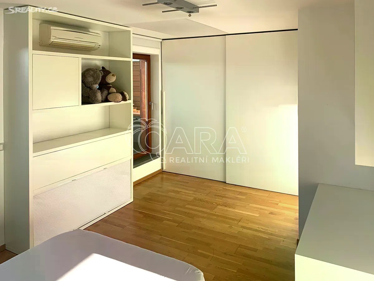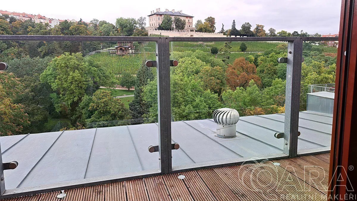 Nabízíme k pronájmu nádherný designově zařízený byt 3+kk s jednou velkou terasou s naprosto jedinečným výhledem na park Grébovka a s druhou menší terasou u ložnic ve Vršovické ulici. Byt je situovaný v 7.patře bytového domu s výtahem a patří k němu i dvougaráž a ještě další parkovací stání. Rozloha bytu je 110m2 a tvoří ho obývací pokoj s plně vybavenou kuchyní, ložnice, dětský pokoj, šatna, koupelna s vanou, sprchovým koutem, toaletou, bidetem, zabudovanou pračkou a dvěma umyvadly, dále předsíň, chodba a další samostatná toaleta s umyvadlem. V celém bytě jsou na míru dělané vestavné skříně se spoustou úložných prostor. Součástí bytu jsou též dvě terasy, hlavní terasa o rozloze cca 30m2 má přímý výhled na Viniční altán a park Grébovka a poskytuje naprosté soukromí. K bytu náleží prostorné garážová stání a krytá uzamykatelná zděná dvougaráž, která je vybavena alarmem a vestavnými skříněmi a slouží jako další místnost pro uskladnění věcí či sportovního náčiní. Přímo v domě se nachází fitness & wellness centrum s bazénem a saunou, potraviny Lidl a restaurace. Pár kroků od domu je též čerpací stanice Mol. Dům se nachází jen několik málo minut chůze od tramvajových zastávek náměstí Bratří Synků, Otakarova a Nádraží Vršovice. Vchod do parku Grébovka je přímo před domem. Poplatky: - nájemné 50.000,-Kč/měsíc - zálohy na služby a energie 9.870,-Kč/měsíc (pro dvě osoby v bytě, za každou další osobu +2.151,-Kč) - vratná kauce 50.000,-Kč - provize RK 50.000,-Kč - elektřina se převádí na nájemce Byt je k dispozici od 1.12.2025