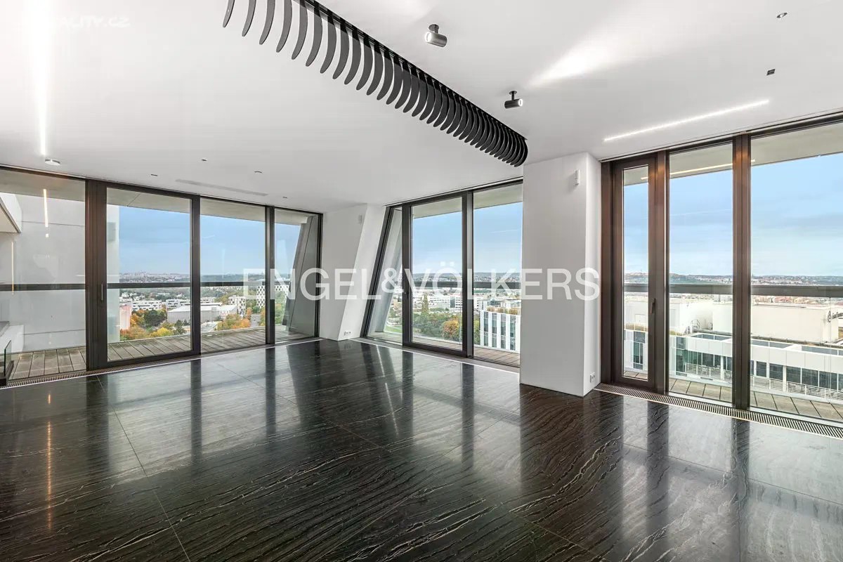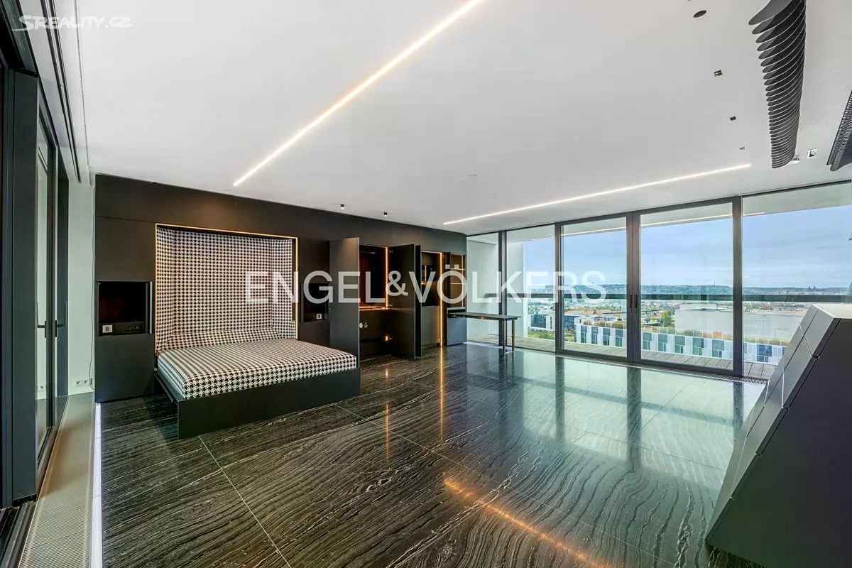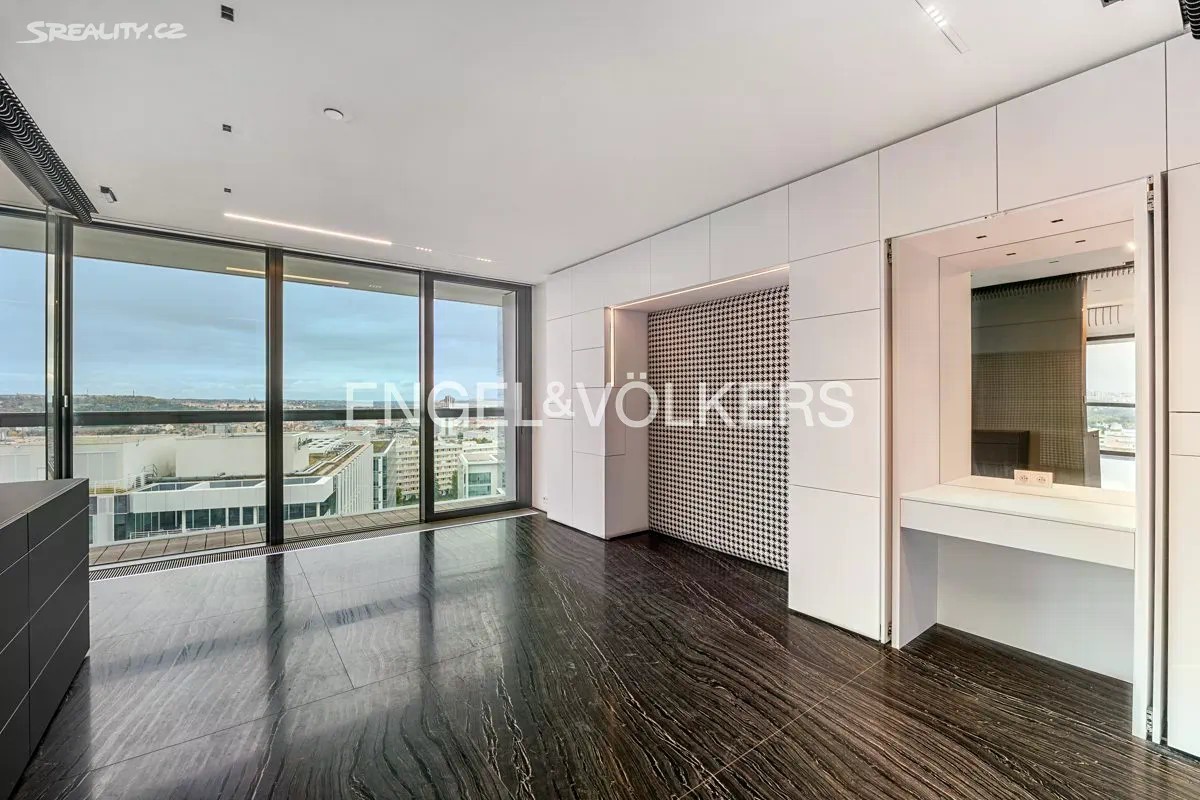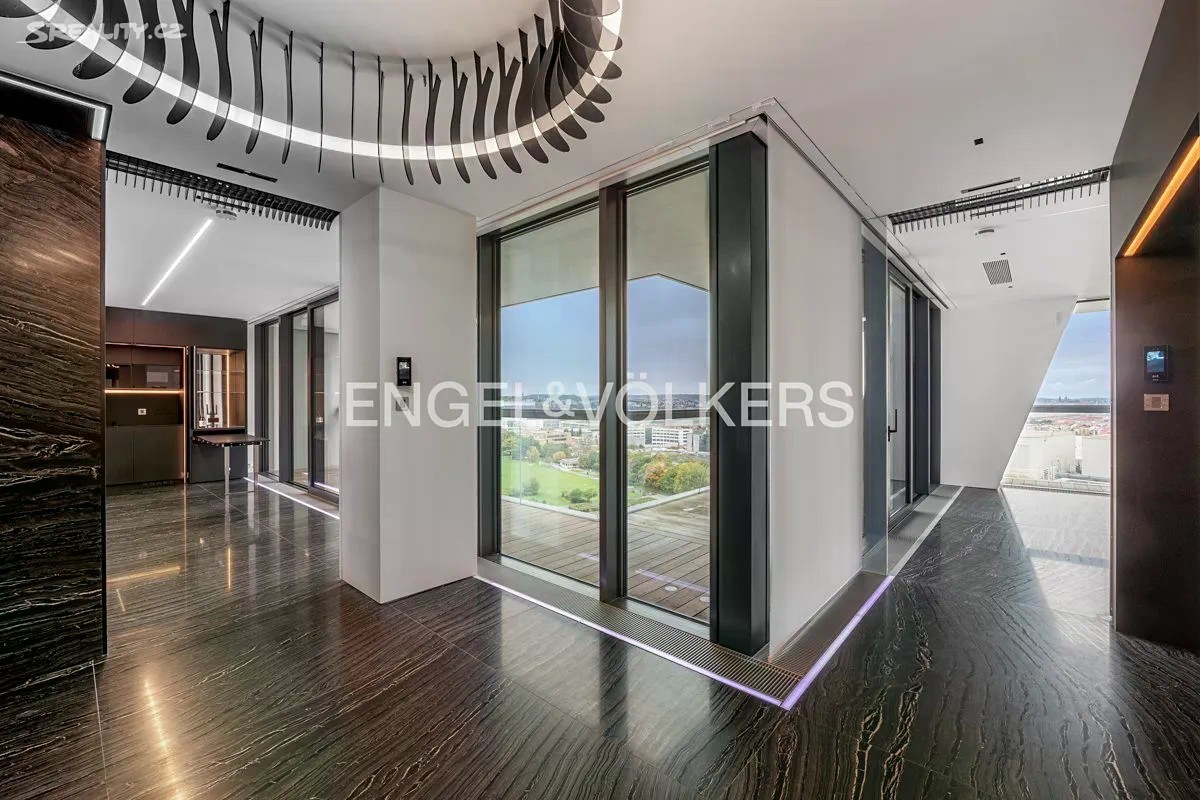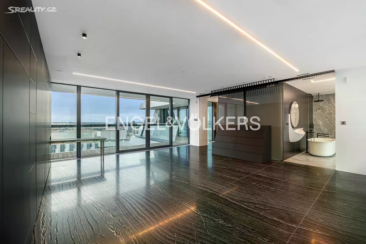 K pronájmu nabízíme mimořádně prostorný a prémiově zařízený byt 3+kk o velikosti 160 m², situovaný v 15. patře prostřední věže prestižní rezidence V Tower - nejvyšší a nejexkluzivnější rezidenční budovy v Praze. Byt se pyšní terasou obepínající celý byt, která nabízí dechberoucí panoramatické výhledy na Prahu a přístup z každé obytné místnosti. Dominantou bytu je prostorný obývací prostor s designovou kuchyní na míru, dále zde naleznete dvě ložnice, dvě velké koupelny s vanou, samostatnou toaletu s technickou místností a šatnu. Interiér je navržen s důrazem na detail a praktičnost, což dokládá vestavěný multifunkční nábytek a dostatek úložných prostor. Celý byt je proveden ve špičkových materiálech - podlahy i koupelny z přírodního mramoru a prémiové vybavení. Rezidence V Tower poskytuje svým rezidentům nejvyšší úroveň služeb - 24/7 recepci a ostrahu, wellness centrum se saunami a bazénem, fitness, soukromé kino, společenský salonek, prádelnu i další doplňkové služby zajišťující maximální komfort. Objekt je centrálně vytápěný a klimatizovaný. Součástí nájmu je parkovací stání v uzavíratelné garáži, s možností pronájmu druhého místa po dohodě. Měsíční nájem je uveden včetně všech poplatků. Zájemce je srozuměn s provizí realitní kanceláře ve výši jednoho měsíčního nájmu + DPH.