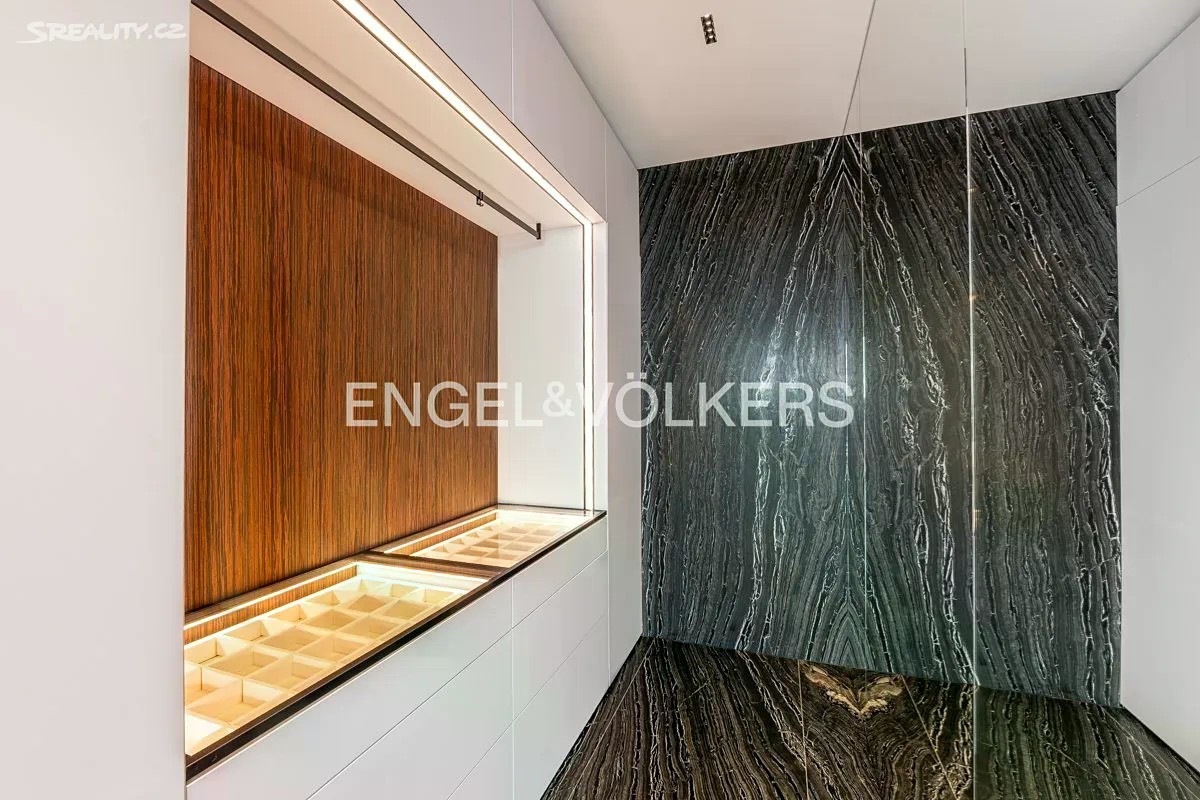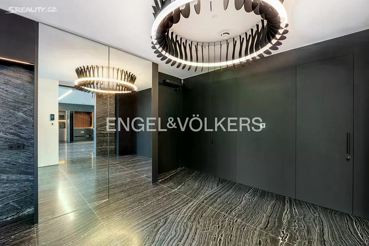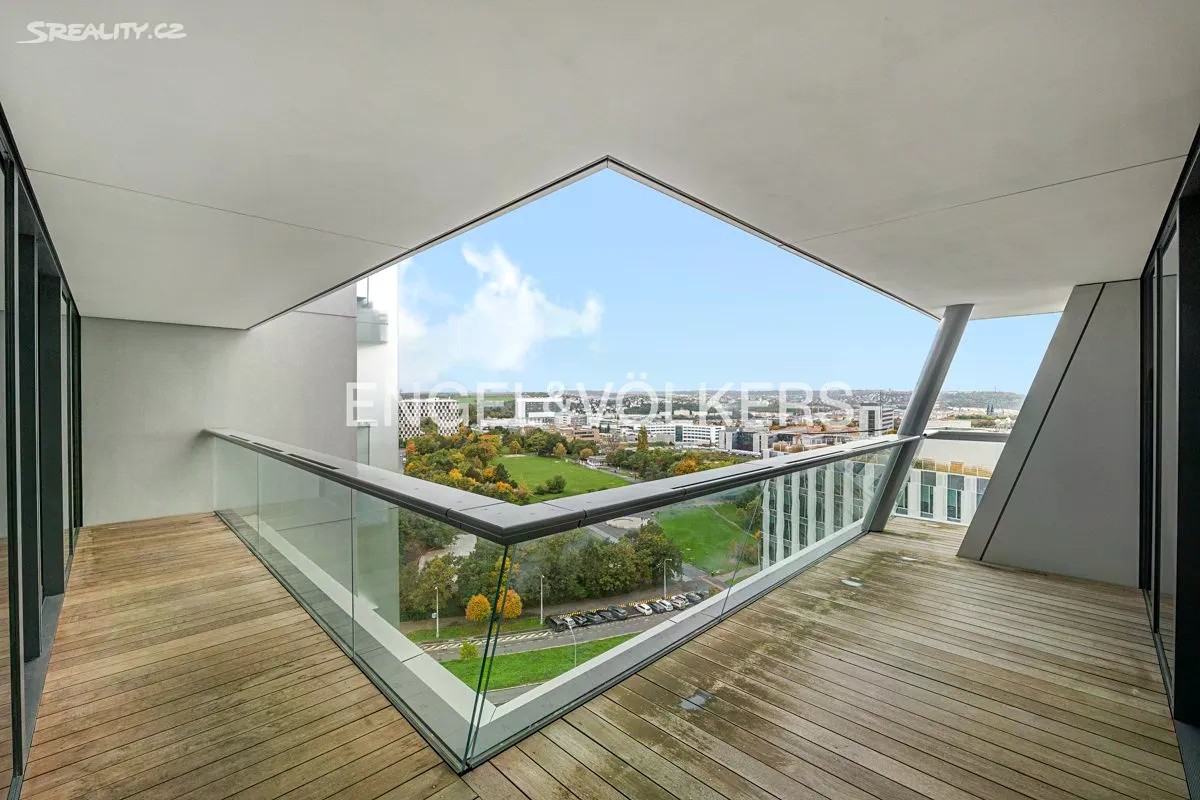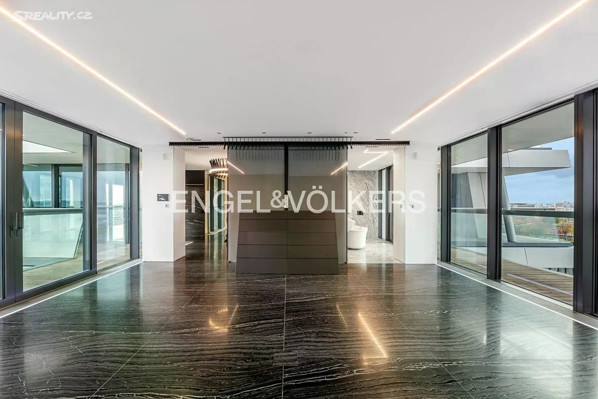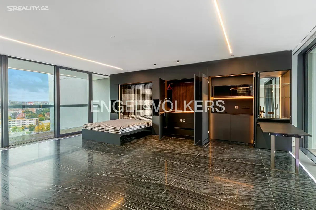 K pronájmu nabízíme mimořádně prostorný a prémiově zařízený byt 3+kk o velikosti 160 m², situovaný v 15. patře prostřední věže prestižní rezidence V Tower - nejvyšší a nejexkluzivnější rezidenční budovy v Praze. Byt se pyšní terasou obepínající celý byt, která nabízí dechberoucí panoramatické výhledy na Prahu a přístup z každé obytné místnosti. Dominantou bytu je prostorný obývací prostor s designovou kuchyní na míru, dále zde naleznete dvě ložnice, dvě velké koupelny s vanou, samostatnou toaletu s technickou místností a šatnu. Interiér je navržen s důrazem na detail a praktičnost, což dokládá vestavěný multifunkční nábytek a dostatek úložných prostor. Celý byt je proveden ve špičkových materiálech - podlahy i koupelny z přírodního mramoru a prémiové vybavení. Rezidence V Tower poskytuje svým rezidentům nejvyšší úroveň služeb - 24/7 recepci a ostrahu, wellness centrum se saunami a bazénem, fitness, soukromé kino, společenský salonek, prádelnu i další doplňkové služby zajišťující maximální komfort. Objekt je centrálně vytápěný a klimatizovaný. Součástí nájmu je parkovací stání v uzavíratelné garáži, s možností pronájmu druhého místa po dohodě. Měsíční nájem je uveden včetně všech poplatků. Zájemce je srozuměn s provizí realitní kanceláře ve výši jednoho měsíčního nájmu + DPH.