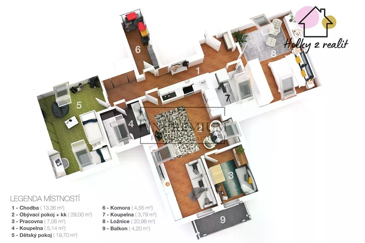 Tento prostorný byt se čtyřmi pokoji a užitnou plochou 108 m² disponuje ložnicí, obývacím pokojem s kuchyňským koutem, dětským pokojem, samostatnou pracovnou, dvěma koupelnami, šatnou a vlastní garáží. Nabízí ideální kombinaci pohodlí, funkčnosti a klidného bydlení v příjemné lokalitě. Tento byt vás zaujme klidem, protože se nachází v posledním podlaží (3.NP), a dále nabízí promyšlenou dispozici, dostatek úložného prostoru a příjemnou atmosféru, díky které se tu budete cítit jako doma hned od prvního okamžiku. Dominantou bytu je světlý a vzdušný obývací prostor spojený s kuchyní a jídelní částí. Kuchyň je navržena prakticky, nabízí dostatek pracovní plochy i úložných prostor, takže vaření bude radostí. Z obývací části je vstup na prostorný balkón, který zve k ranní kávě na slunci nebo k večernímu posezení u sklenky vína. Byt disponuje dvěma koupelnami - jednou s vanou, druhou se sprchovým koutem - což zaručuje pohodlí pro vícečlennou domácnost i pro hosty. K dispozici je také samostatná šatna, která elegantně řeší úložné prostory, a samostatná pracovna, ideální pro home office. Dalším velkým benefitem je společná zahrada, kterou mohou obyvatelé domu využívat k relaxaci nebo posezení s rodinou a přáteli. K bytu náleží i vlastní garáž, což je v dnešní době obrovská výhoda - už žádné hledání parkovacího místa po návratu domů a další možnost úložného prostoru. Lokalita bytu nabízí vše potřebné v pěší vzdálenosti. Jen pár minut chůze vás dělí od základní školy, obchodů i příjemné procházky k nedalekému rybníku. Klidné prostředí, dostatek zeleně a zároveň skvělá dostupnost všech služeb dělají z tohoto bytu ideální domov pro rodinu, pár i jednotlivce, kteří hledají prostor, pohodlí a harmonii. Tento byt nabízí rovnováhu mezi městem a přírodou - místo, kde můžete žít naplno a zároveň si dopřát klid, když ho potřebujete. Tohle je příležitost, která se nebude opakovat, tak si domluvte prohlídku co nejdříve. S financováním nemovitosti hypotékou Vám rádi pomůžeme. Pro více informací mě neváhejte kontaktovat.
