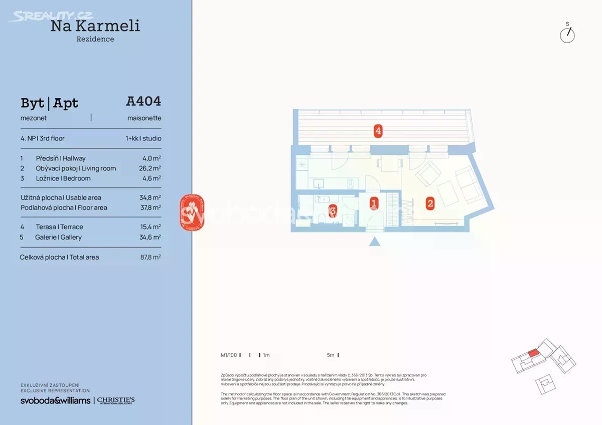 Novostavba jednopokojového bytu s velkou terasou se nachází v prémiové rezidenci Na Karmeli, která právě vzniká na pěkném místě v samém centru Mladé Boleslavi nedaleko lesoparku. Projekt je těsně před dokončením, byt bude k nastěhování v 1. čtvrtletí r. 2026. Plochu bytu umístěného ve 4. podlaží tvoří obytná místnost s navazujícím prostorem pro kuchyňský kout, galerie, koupelna (se sprchovým koutem as WC) a předsíň. Z obývací i kuchyňské části vede vstup na prostornou terasu, v obývací části je navíc schodiště na galerii. Energeticky velmi úsporný dům má výtah, spoustu denního světla propouštějí do bytu francouzská okna s trojskly, standard zahrnuje klimatizaci, dřevěné podlahy (dub), velkoformátovou dlažbu, interiérové dveře Sapeli, elegantní sanitu Hüppe, Kaldewei a Catalano a baterie Tresgriferia. Vytápění je řešeno centrální plynovou kotelnou. K bytu přísluší sklep, přikoupit je možné vnitřní nebo venkovní parkovací stání. Součástí uzavřené rezidence je privátní parčík s upravenou zelení a posezením. Díky skvělé poloze rezidence přímo v historickém jádru města je vše potřebné v docházkové vzdálenosti - obchody, restaurace, kavárny, úřady, banky či lékařské služby. Blízký lesopark Štěpánka, přírodní rezervace Radouč s kolonií syslů, 18jamkové golfové hřiště Sand Martin's Holes či hustá síť cyklostezek poskytují skvělé zázemí pro aktivní odpočinek. Podlahová plocha 37,8 m2 + galerie 25,2 m2, terasa 15,4 m2, sklep 4,6 m2.