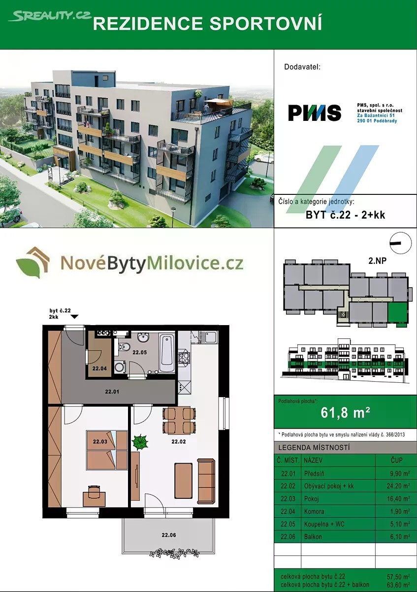 Dobrý den, Dovolte mi představit jeden ze 44 krásných bytů v nově vznikajícím projektu Rezidence Sportovní v Milovicích. Výstavba nyní započala a realizuje ji společnost s dlouholetou tradicí a praxí v oboru, firma PMS Poděbrady. Nabízený byt 2+kk č. 22 potěší balkonem 6,1 m², ideálním na ranní kávu či bylinkový truhlík. Obývací pokoj je přímo propojen s kuchyní i jídelnou, takže celý prostor působí vzdušně a pohodlně. V bytě je praktická technická komora, nebo ji můžete využít jako šatnu, to záleží na Vás, dále koupelna s vanou. Podlahové vytápění se stará o příjemné teplo a více místa bez radiátorů. Samozřejmostí je příprava na předokenní žaluzie. Kolaudace: květen 2027 (předání v létě 2027). Standardy projektu • Každý byt má balkon, terasu nebo předzahrádku • Podlahové topení v celém bytě • Technická komora v každé jednotce • Příprava na předokenní žaluzie • Výtah v domě • Centrální plynová kotelna, která vytápí celý dům a ohřívá vodu • Klientské změny: možnost výběru dekorů vinylových podlah, obkladů a dlažeb, interiérových dveří, výměna vany za sprchu apod. Parkování a sklepy (volitelné dokoupení) • Venkovní parkovací stání: 130 000 Kč • Vnitřní parkovací stání: 250 000 Kč • Vnitřní parkovací stání se sklepem: 300 000 Kč • Samostatný sklep: 90 000 Kč Lokalita Projekt vzniká v Milovicích - klidné lokalitě s výbornou dostupností a veškerou občanskou vybaveností. Více informací o projektu a volných jednotkách najdete na rezidencesportovni cz. Součástí naší nabídky je kompletní servis - právní služby a zajištění všech potřebných dokumentů, pomoc se zajištěním nejvýhodnějšího financování, pojištění nemovitosti i domácnosti. Pro více informací, nebo schůzku se na mě neváhejte obrátit.