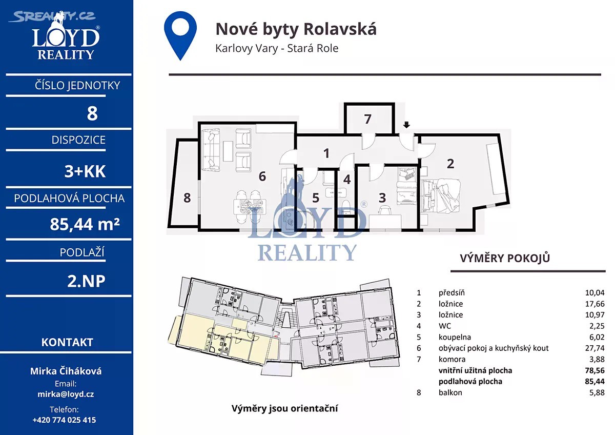 Poslední byt v projektu na prodej! Bytový dům Rolavská je umístěn v klidné části Karlových Varů, ve čtvrti Stará Role na břehu řeky Rolavy. Byt 3+kk o ploše 85,44 m2 se nachází ve 2. nadzemním podlaží. Okna má orientovaná na východ a jih. Součástí bytu je komora a balkon o výměře 5,88 m2. Pro Vaše komfortní bydlení je v bytech podlahové vytápění, energetická třída B - velmi úsporná, samostatné dálkové měření. Plně vybavení koupelny se zařizovacími předměty, keramické obložení podlah a stěn, sprchový kout, WC, umyvadlo se skříňkou, radiátor. Obytné místnosti a chodby budou mít plovoucí podlahy, vstupní a vnitřní dveře se zárubní. Velká okna pro dostatek přirozeného osvětlení místností. Datové připojení optickým kabelem až do bytu zajistí rychlý internet a TV. Dům má dva vchody a výtah. V přízemí je k dispozici kočárkárna. Ke každému bytu je možno koupit venkovní parkovací stání za cenu 100.000 Kč v uzavřeném areálu, prvních 14 zájemců si může koupit druhé místo navíc. V docházkové vzdálenosti najdete veškerou občanskou vybavenost - školka, škola, zdravotní středisko a lékárna, nákupní centrum, pošta, zastávka MHD atd. Kolem domu prochází Karlova cyklostezka do Nové Role. Nové byty Rolavská jsou ideální volbou pro moderní a pohodlné bydlení v klidné lokalitě blízko přírody a zároveň také investiční příležitostí.