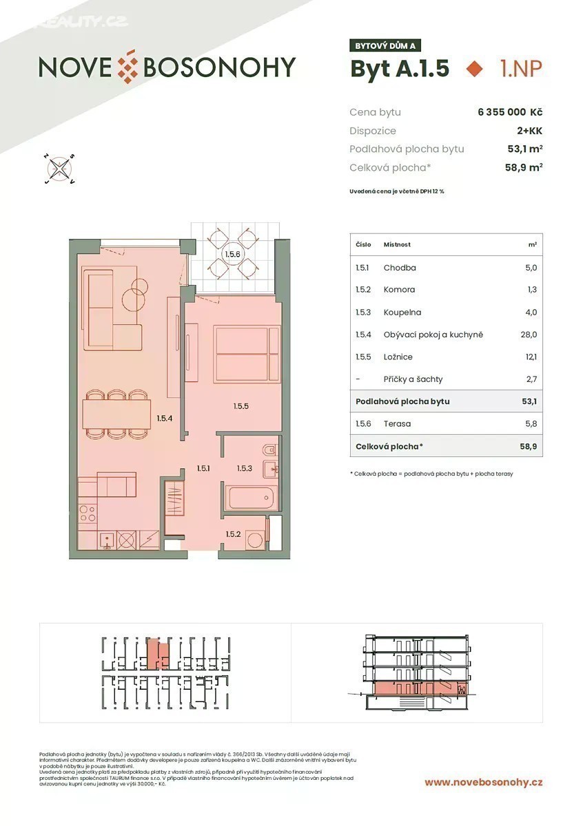 Zajímavá bytová jednotka dispozice 2+kk s celkovou plochou 64,6 m2, s terasou a balkonem v blízkosti lesa v právě vznikajícím moderním developerském projektu NOVÉ BOSONOHY. Příslušný byt je situován v 1.NP bytového domu A. Dům A má celkově čtyři nadzemní podlaží a jedno podzemní podlaží. Jednotka označená A.1.12 má podlahovou plochu 53,3 m2, plochu terasy 6,3 m2, plochu balkonu 5,0 m2 a orientaci oken na jihovýchod. *** Zaváděcí ceny do konce roku 2025 *** Cena bytu: 6.630.000,- Kč vč. DPH Vybrané standardy: Hliníková okna a balkonové dveře s izolačními trojskly, el. ovládané předokenní žaluzie na všech oknech, bílé interiérové dveře 2100 mm s obložkovými zárubněmi, vinylové podlahy, atypická otopná tělesa, FVE elektrárna na střeše domu, výtah, společná domovní terasa s nádherným výhledem do okolí o ploše 66 m2 a mnoho dalšího. Výstavba: Zahájení 1Q/2026, kolaudace 2Q/2027 Způsob plateb: 10 % z kupní ceny při rezervaci bytu 40 % z kupní ceny po vymezení jednotky v KN 50 % z kupní ceny po dokončení bytu Veškeré detaily k této a dalším jednotkám v objektu najdete v sekci O projektu a na webových stránkách developera nebo ideálně při osobní schůzce. Prodej je zajišťován přímo developerem, inzerovaná cena je tedy pevná a konečná, kterou platíte. Dojednejte si s námi osobní schůzku, kde s Vámi vše probereme, těšíme se na vás / We speak English.