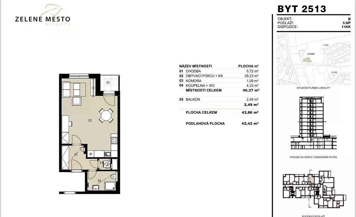 Prodej bytu 1+kk, 42,8 m² - Zelené Město Heights, Praha Nabízíme k prodeji moderní byt 1+kk o velikosti 42,8 m² s balkonem (2,5 m²) v rezidenci Zelené Město Heights. Byt se nachází v 5. nadzemním podlaží novostavby s výtahem. Dispozice: prostorný obývací pokoj s kuchyňským koutem, koupelna s WC, komora a vstupní chodba. V bytě je podlahové vytápění a rekuperace vzduchu pro zdravé a úsporné bydlení. Nízké měsíční náklady: cca 3 000 Kč + elektřina Klidná lokalita s výbornou dostupností do centra, v blízkosti parků a občanské vybavenosti. Byt je ideální jako startovací bydlení nebo investice na pronájem. Cena bytű : 6 800 000- Kċ Cena parkovacího stání : 550 000,- Kč Cena sklepa : 150 000, - Kč K bytu je nutno přikoupit sklep a parking.