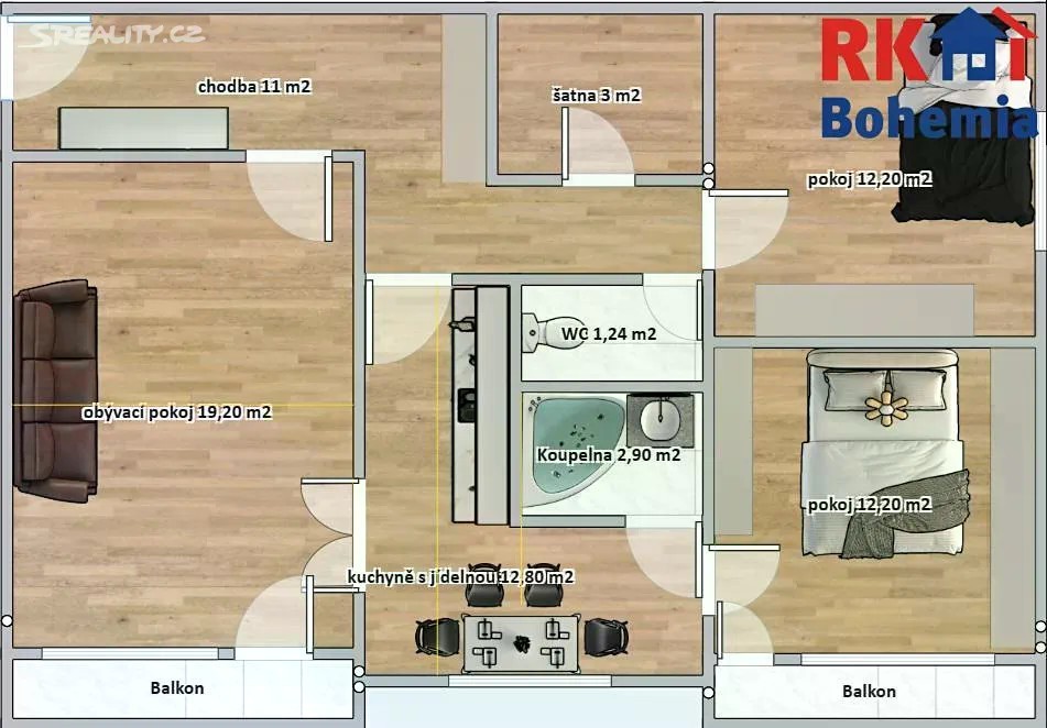 Nabízím Vám k pronájmu byt 3+1 se 2 lodžiemi a sklepní kójí v ulici Přetlucká v Praze Strašnicích. Byt se nachází 8. patře z 11 v panelovém domě s výtahem. V bytě se nachází ložnice (12,20 m2), obývací pokoj (19,2 m2), pokoj (12,2 m2), kuchyň (12,8 m2), koupelna s vanou a umyvadlem (2,9 m2), samostatné WC s umyvadlem (1,24 m2), komora (3 m2) a prostorná předsíň (11 m2). Užitná plocha bytu je 74,54 m2 + sklepní kóje 1,24 m2 + 2 lodžie (2 x 2,56 m2). Byt má výborně půdorysně uspořádané místnosti, které zajišťují maximální využití prostoru a dostatek přirozeného světla. Jednotlivé místnosti na sebe smysluplně navazují, čímž byt nabízí soukromí pro každého člena domácnosti. Ze všech 4 místností jsou krásné výhledy na Prahu. Byt je ve výborném udržovaném stavu a je pronajímán včetně nábytku a vybavení, které je zobrazeno na fotografiích bytu. Součástí kuchyňské linky je vestavěná lednice s mrazákem, mikrovlnná trouba, myčka, elektrická trouba, kombinovaná varná deska, digestoř a pračka. Na podlahách je položeno linoleum, v koupelně a na WC je dlažba. V domě je možno využívat společnou kolárnu. Měsíční nájemné činí 22.000,- Kč + poplatky 5.500,- Kč (při obsazenosti 2 osobami). Dopředu je majitelem vyžadována kauce ve výši 44.000,- Kč a provize RK je ve výši 15.000,- Kč. V okolí je veškerá občanská vybavenost a nepřeberné množství sportovních aktivit. Poloha domu zajišťuje výbornou dostupnost do centra Prahy. Nejbližší zastávka autobusu Na Padesátém je vzdálena cca 150 m a nejbližší zastávka tramvaje i PID (vlak) Nádraží Zahradní Město je vzdálená cca 350 m. Zastávka metra Skalka je vzdálená 550 m (cca 8 minut chůzí). Byt je ihned volný k nastěhování. V případě jakýchkoliv dotazů, případně sjednání prohlídky, mě prosím kontaktujte v pracovní dny mezi 9:00 a 18:00.