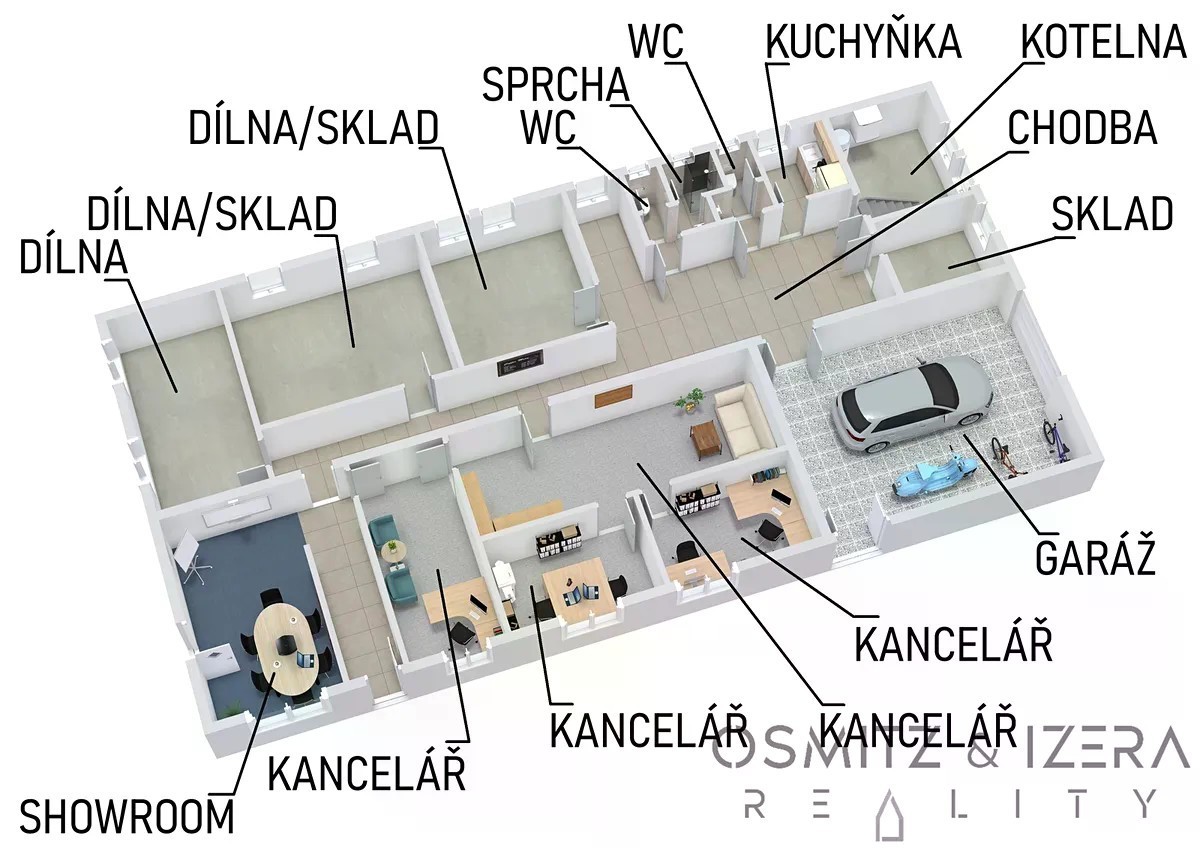 Nabízíme k prodeji zajímavý komerční objekt situovaný v ulici Nad rybníkem, v části Dolní Počernice, Praha 9. Tento přízemní dům s užitnou plochou 223 m² se nachází v klidné lokalitě s výbornou dopravní dostupností, což z něj činí ideální místo pro podnikání i bydlení. Objekt je ve velmi dobrém stavu a nabízí široké spektrum využití. Lze jej dále provozovat jako komerční prostor, například jako veterinární kliniku, sídlo e-shopu nebo jiné služby. Vzhledem k dispozici a možnosti přestavby pro účely bydlení jsme připravili vizualizaci studie přestavby objektu na rodinný dům o třech bytových jednotkách, což na současném trhu s nemovitostmi představuje atraktivní příležitost pro investování. Možnosti budoucího využití A) Aktuálně je objekt využíván a zkolaudován jako občanská vybavenost - vhodné pro sídlo firmy, k dispozici řada kanceláří, sociální zařízení, velký počet parkovacích míst - sídlo e-shopu, k dispozici kanceláře, skladové prostory, showroom, vysoká garáž s rampou na vykládání zboží - alternativní adaptace prostor např. na Veterinární ambulanci apod. B) Objekt leží podle územního plánu v lokalitě určené pro bydlení - možnost přestavby na velkou vilu - přestavba na bytový objekt s možností více jednotek Součástí objektu je jedna velká garáž a k dispozici je dále celkem osm parkovacích míst, což zajišťuje vysoký komfort pro zákazníky i zaměstnance. V rámci technického vybavení je objekt napojen na obecní kanalizaci, vodovod a plynovod. Objekt je připojen třemi fázemi elektřiny, což zajišťuje dostatečný výkon pro jakékoli komerční využití. Naprosto skvělá je lokalita umístění nemovitosti. Téměř na břehu rybníka s výhledem do krajiny si nebudete připadat jako ve městě plném lidí, ale spíše jako na venkově. Dolní Počernice nabízejí veškerou občanskou vybavenost, včetně školy, školky a obchodů. Díky MHD i vlakovému spoji je místo snadno dostupné jak pro zaměstnance, tak pro klienty. Nespornou výhodou je potom napojení na Jižní spojku pro uživatele automobilů. Vítaná je také blízkost Černého mostu. V případě zájmu o prohlídku nás neváhejte kontaktovat.