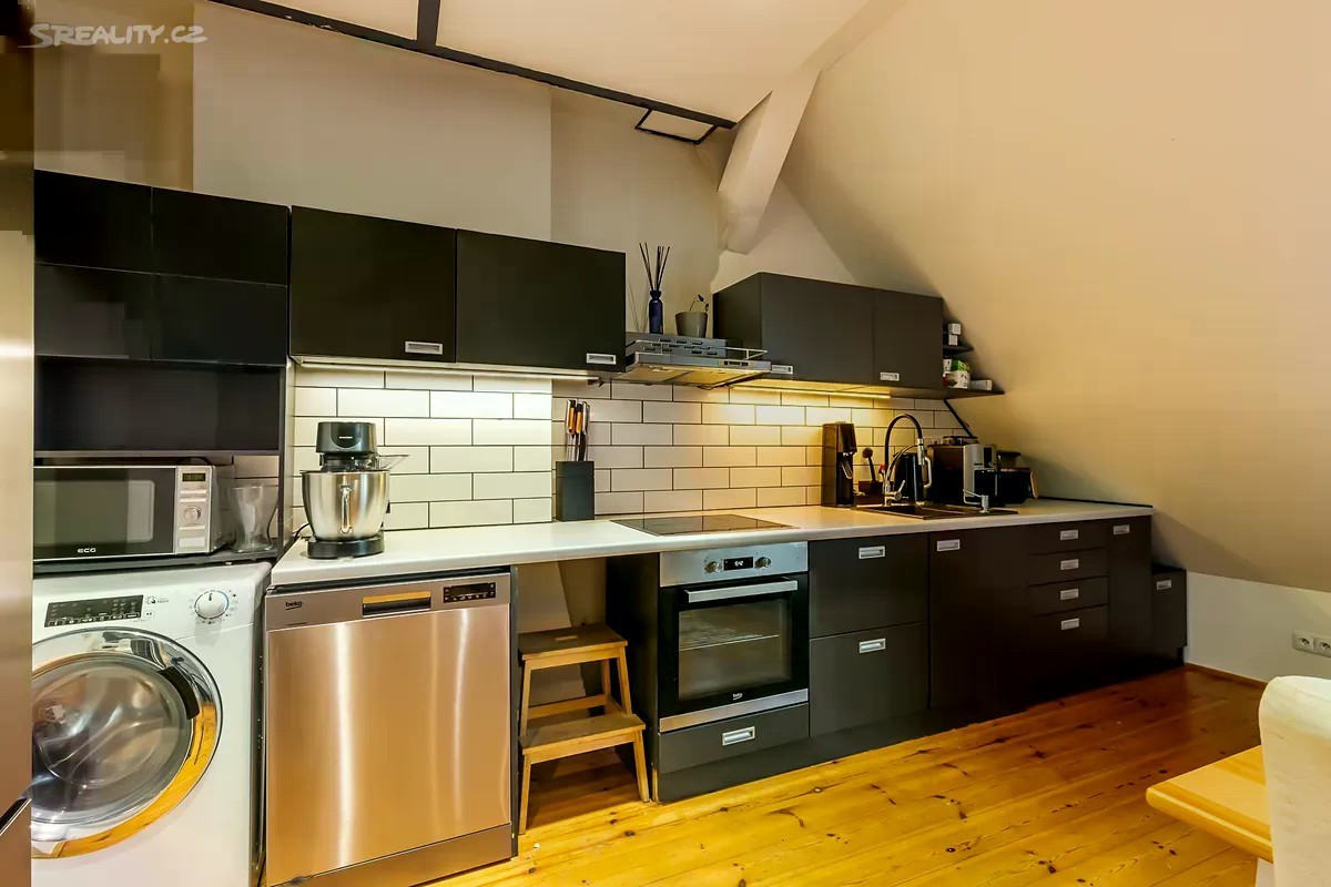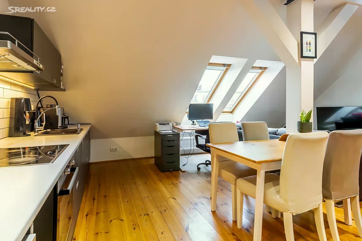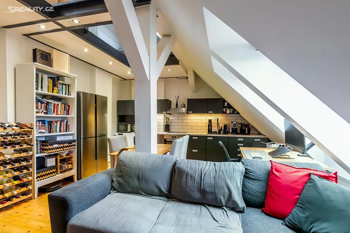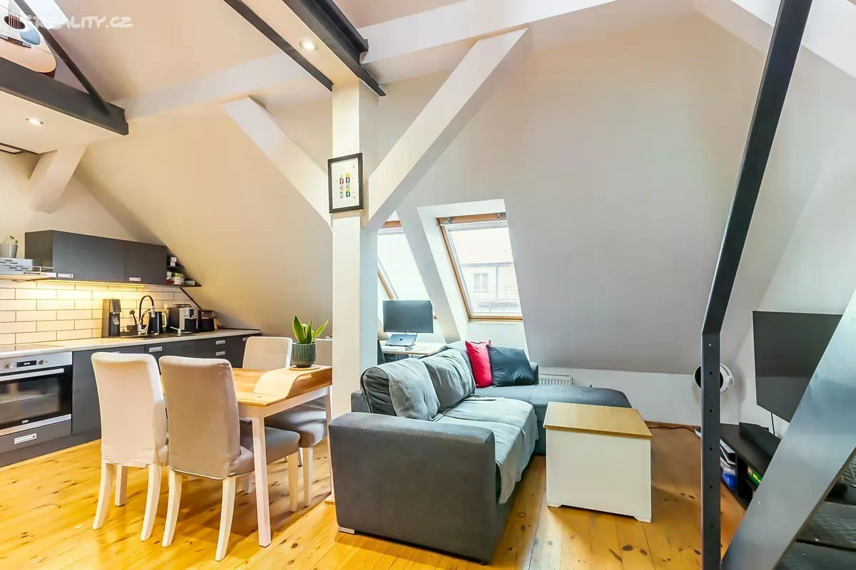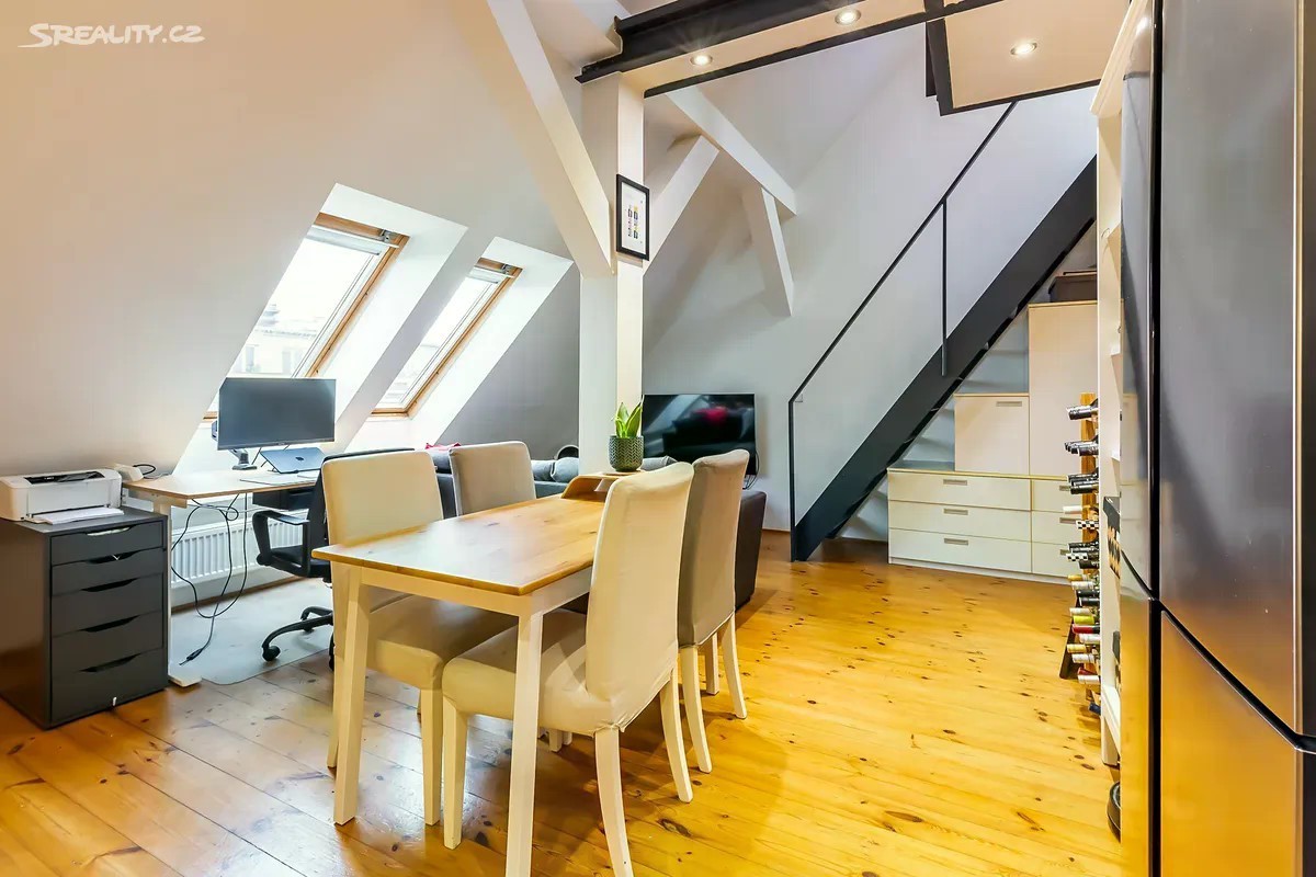 Exkluzivní prodej mezonetového půdního bytu 2kk v pěší vzdálenosti na metro A Flóra/Želivského, v lukrativní části Praha 3 - Vinohrady, nám. Jiřího z Lobkovic. Osobní vlastnictví - možnost financovat hypotékou (se kterou Vám případně pomohu). Velmi nízké zálohy na služby, a to pouze 670 Kč + energie dle skutečné spotřeby (elektřina a plyn, cca. 2.500 Kč), a to z důvodu, že dům pronajímá 5 nebytových prostor, které pokryjí náklady spojené s provozem domu: Výborná dopravní dostupnost - Metro A Želivského 5 min pěšky nebo tramvaj. V blízkosti domu veškerá občanská vybavenost. Velmi světlý byt o celkové velikosti 55,3 m2 - dle Prohlášení vlastníka 45,3 m2 (prostor celé galerie se nezapočítává vzhledem k přesahu kovové konstrukce nad obytný spodní prostor). K bytu náleží sklep umístěný v 1. PP. Byt se nachází v 6. a 7. NP/6 - s výtahem, cihlového domu, který prošel revitalizací, a to zejména: • fasáda, • dřevěná střešní okna v bytě, • rozvody vody v plastu. Byt z roku 2013: • elektrické rozvody (tři fáze), • rozvody slaboproudu, • rozvody vody a odpadů, • zděné jádro - vana, samostatné WC. • podlahy - dřevo v obou podlažích. • vestavěné úložné prostory pod schody, • kovové schodiště do na galerii patra. Orientace bytu sever a jih. Průkaz energetické náročnosti budovy nebyl předložen, a proto dle zákona uvádíme hodnotu G. Více informací u makléře.