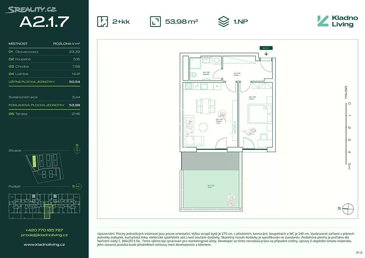 Nabízíme ke koupi moderní byt 2+kk o podlahové ploše 53,6 m² s balkonem 4,5 m² v rezidenčním projektu Kladno Living, který vzniká v jedné z nejatraktivnějších lokalit města Kladno - Kročehlavy. Tento nový developerský projekt představuje jedinečnou příležitost pro ty, kteří hledají nové byty v Kladně nebo investici do nemovitosti s vysokým potenciálem zhodnocení. Projekt Kladno Living tvoří pět elegantních bytových domů (A-E) s celkem 371 jednotkami a nabízí ideální spojení klidného bydlení v zeleni a skvělé dopravní dostupnosti. Rezidenti ocení kromě plné občanské vybavenosti v okolí i vlastní sousedskou zahradu, dětské hřiště, okolní lesopark Nové Boroviny i výborné napojení na Prahu a Letiště Václava Havla. Zastávka MHD Pražská křižovatka se nachází přímo u projektu - do centra Kladna se dostanete během pár minut a na pražské metro Nádraží Veleslavín za přibližně 25 minut. Byty na prodej v Kročehlavech jsou navrženy s důrazem na funkčnost, úsporu energií a maximální komfort. Od útulných 1+kk po prostorné rodinné 4+kk - každý byt disponuje efektivním dispozičním řešením a dostatkem úložného prostoru. Většina jednotek nabízí balkon, terasu nebo předzahrádku, které rozšiřují obytný prostor. Součástí projektu je dostatek parkovacích míst a sklepních kójí. Nízkoenergetický projekt Kladno Living (PENB B) dbá na udržitelnost a moderní technologie - byty disponují rekuperačním systémem, úsporným podlahovým vytápěním a přípravou pro venkovní hliníkové žaluzie. Chybět nebudou fotovoltaické panely ani zelené střechy. Díky těmto řešením nabízí byty zdravé a komfortní vnitřní prostředí s dostatkem přirozeného světla a nízkými provozními náklady. Vysoký standard vybavení zahrnuje kvalitní vinylové podlahy, designové keramické obklady a dlažby (60x60 cm), zvýšené stropy v obývacích místnostech (2 750 mm), plastová okna s izolačním trojsklem, bezfalcové interiérové dveře s magnetickými zámky a kvalitní sanitu s bateriemi značky Gröhe. Kladno Living - moderní bydlení blízko Prahy, kde klid, prostor a pohodlí tvoří nový standard života. Prodej projektu probíhá ve třech etapách. Kolaudace 1. etapy (budovy A a B) je plánována na 2. čtvrtletí roku 2027.