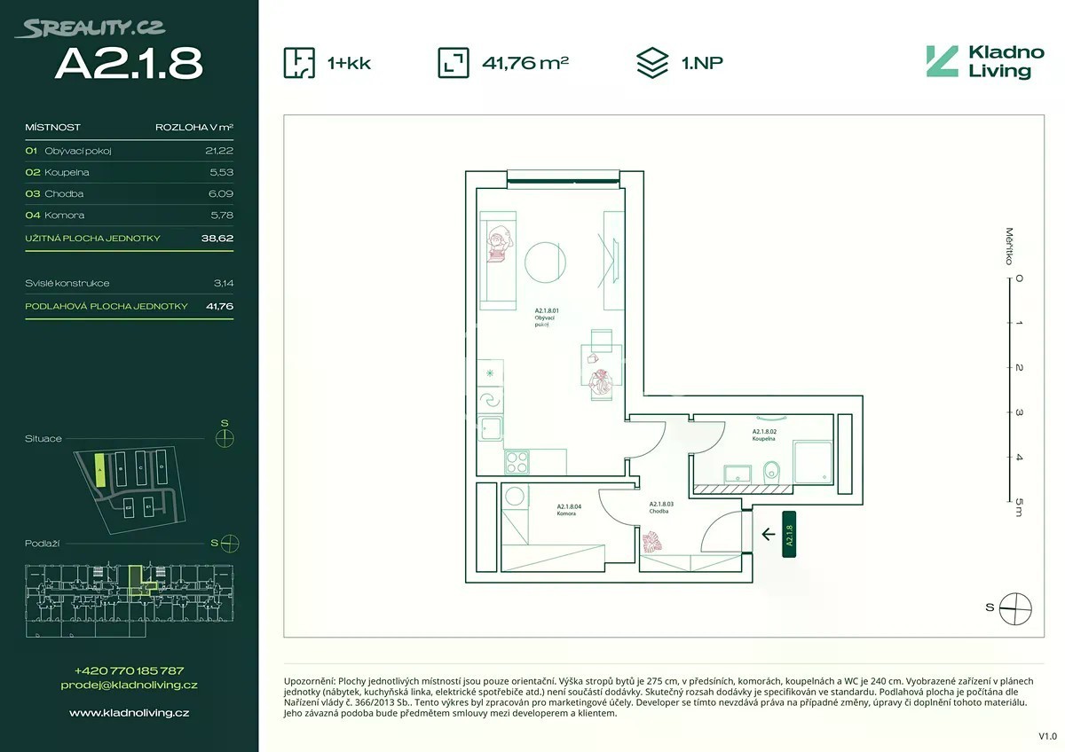 Nabízíme ke koupi moderní byt 1+kk (1,5+kk) o podlahové ploše 45 m² v rezidenčním projektu Kladno Living, který vzniká v jedné z nejatraktivnějších lokalit města Kladno - Kročehlavy. Tento nový developerský projekt představuje jedinečnou příležitost pro ty, kteří hledají nové byty v Kladně nebo investici do nemovitosti s vysokým potenciálem zhodnocení. Projekt Kladno Living tvoří pět elegantních bytových domů (A-E) s celkem 371 jednotkami a nabízí ideální spojení klidného bydlení v zeleni a skvělé dopravní dostupnosti. Rezidenti ocení kromě plné občanské vybavenosti v okolí i vlastní sousedskou zahradu, dětské hřiště, okolní lesopark Nové Boroviny i výborné napojení na Prahu a Letiště Václava Havla. Zastávka MHD Pražská křižovatka se nachází přímo u projektu - do centra Kladna se dostanete během pár minut a na pražské metro Nádraží Veleslavín za přibližně 25 minut. Byty na prodej v Kročehlavech jsou navrženy s důrazem na funkčnost, úsporu energií a maximální komfort. Od útulných 1+kk po prostorné rodinné 4+kk - každý byt disponuje efektivním dispozičním řešením a dostatkem úložného prostoru. Většina jednotek nabízí balkon, terasu nebo předzahrádku, které rozšiřují obytný prostor. Součástí projektu je dostatek parkovacích míst a sklepních kójí. Nízkoenergetický projekt Kladno Living (PENB B) dbá na udržitelnost a moderní technologie - byty disponují rekuperačním systémem, úsporným podlahovým vytápěním a přípravou pro venkovní hliníkové žaluzie. Chybět nebudou fotovoltaické panely ani zelené střechy. Díky těmto řešením nabízí byty zdravé a komfortní vnitřní prostředí s dostatkem přirozeného světla a nízkými provozními náklady. Vysoký standard vybavení zahrnuje kvalitní vinylové podlahy, designové keramické obklady a dlažby (60x60 cm), zvýšené stropy v obývacích místnostech (2 750 mm), plastová okna s izolačním trojsklem, bezfalcové interiérové dveře s magnetickými zámky a kvalitní sanitu s bateriemi značky Gröhe. Kladno Living - moderní bydlení blízko Prahy, kde klid, prostor a pohodlí tvoří nový standard života. Prodej projektu probíhá ve třech etapách. Kolaudace 1. etapy (budovy A a B) je plánována na podzim roku 2027.